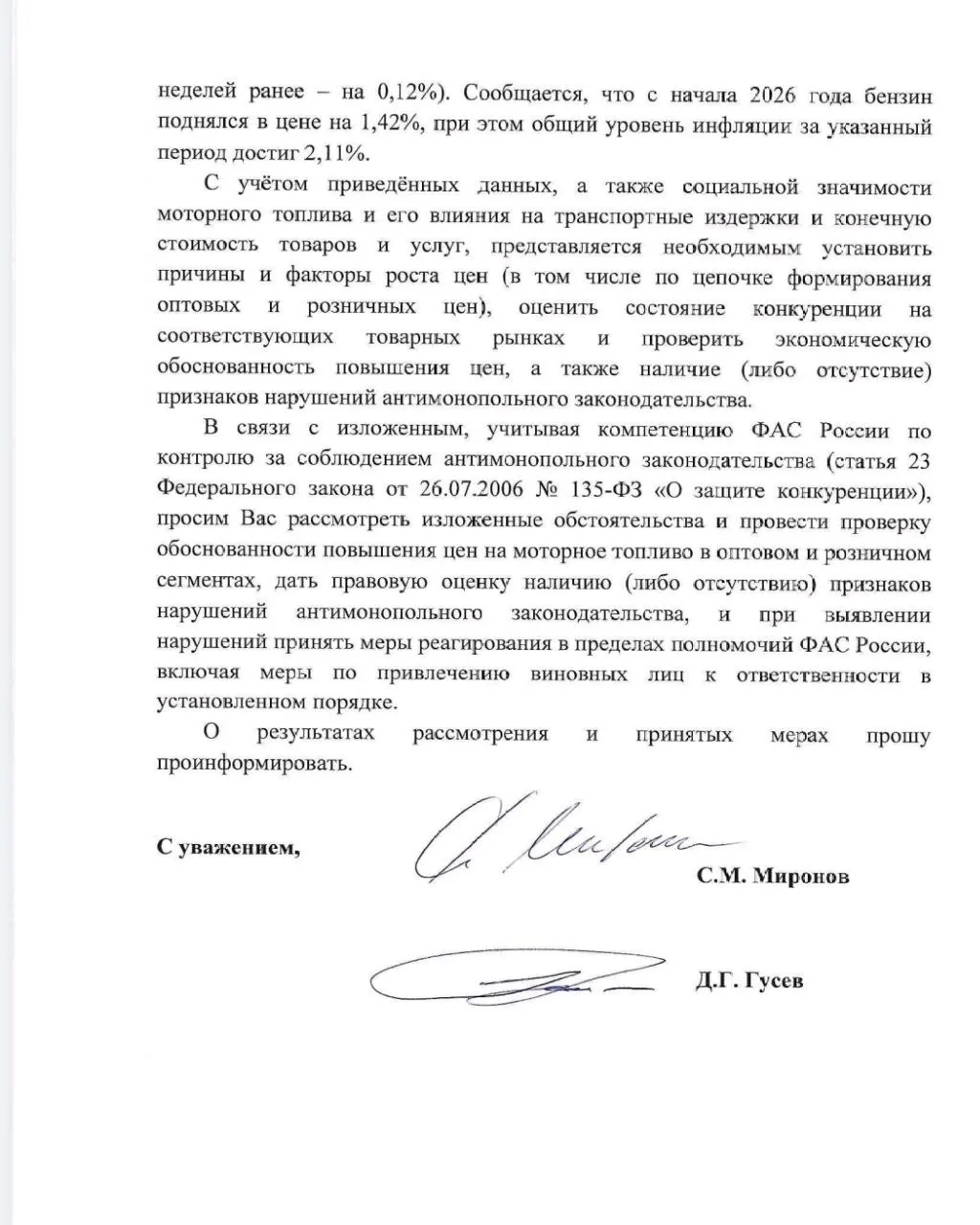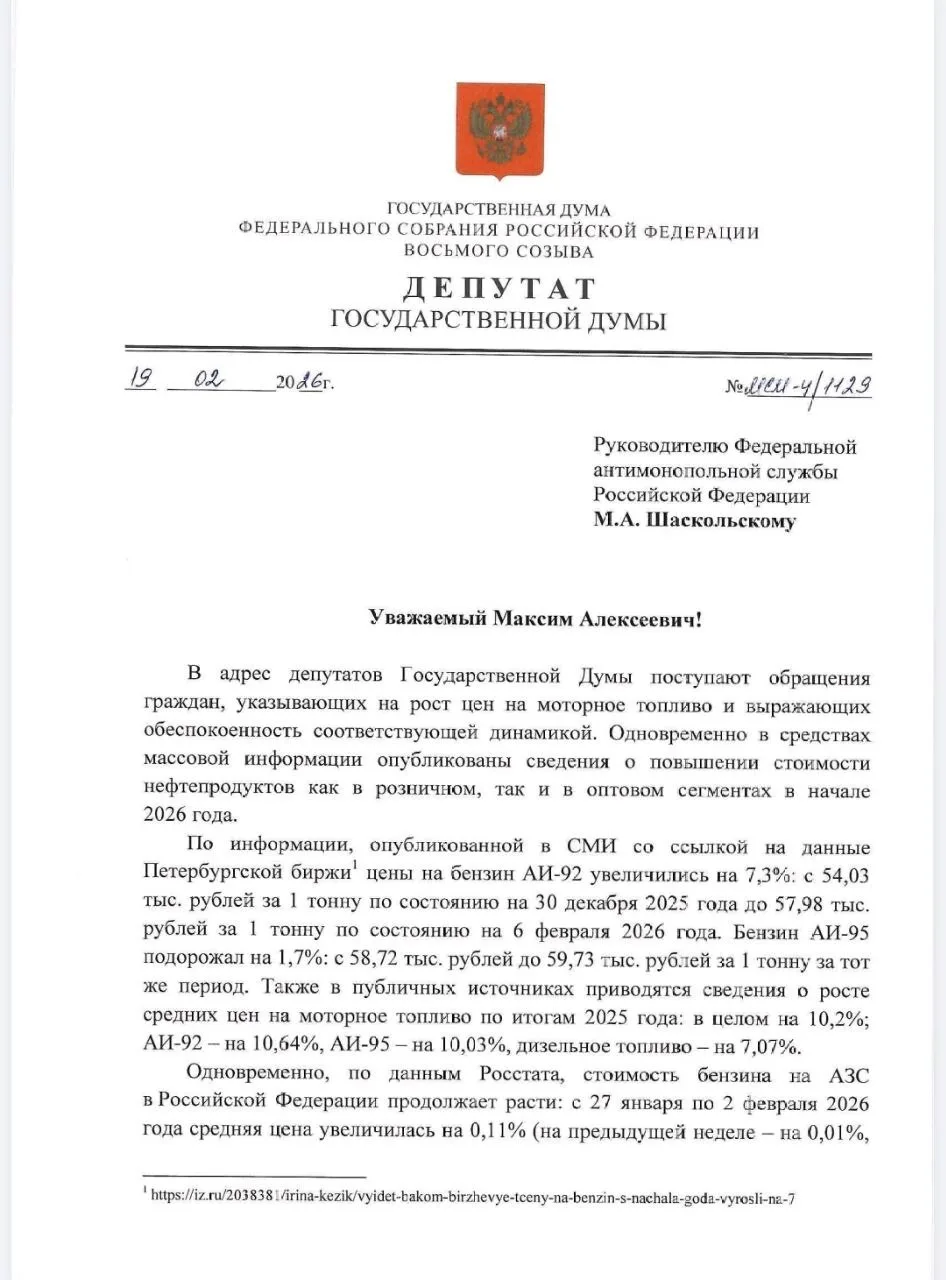 Бензин снова дорожает с начала года, получаю массу жалоб граждан по этому поводу. При этом цены на топливо влияют на конечную стоимость всех товаров и услуг. И очередной скачок цен нам совершенно не нужен! Поэтому в обращении к главе ФАС предлагаю установить причины подорожания – проверить ситуацию с конкуренцией на рынке, обоснованность повышения, возможные нарушения антимонопольного законодательства. И принять меры, в том числе привлечь к ответственности виновных в росте цен. Надеюсь, ведомство отреагирует оперативно и по существу.