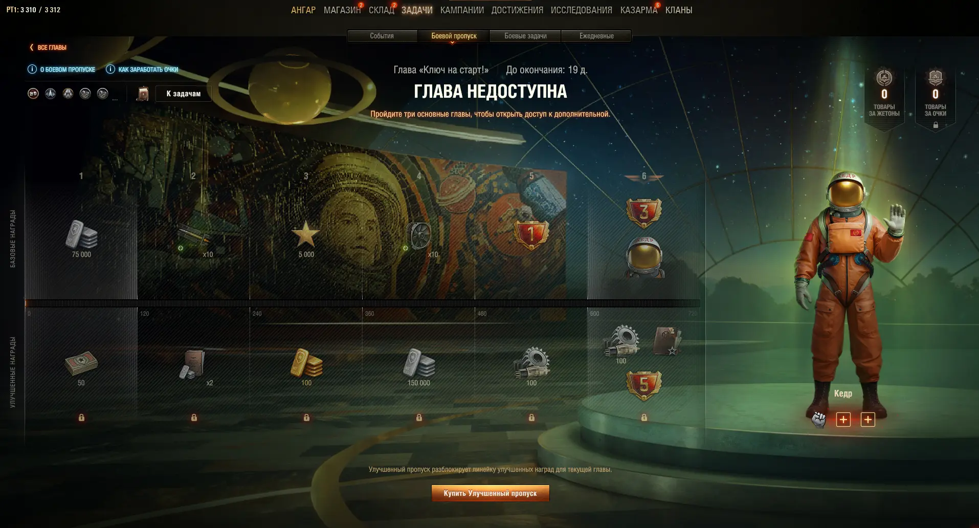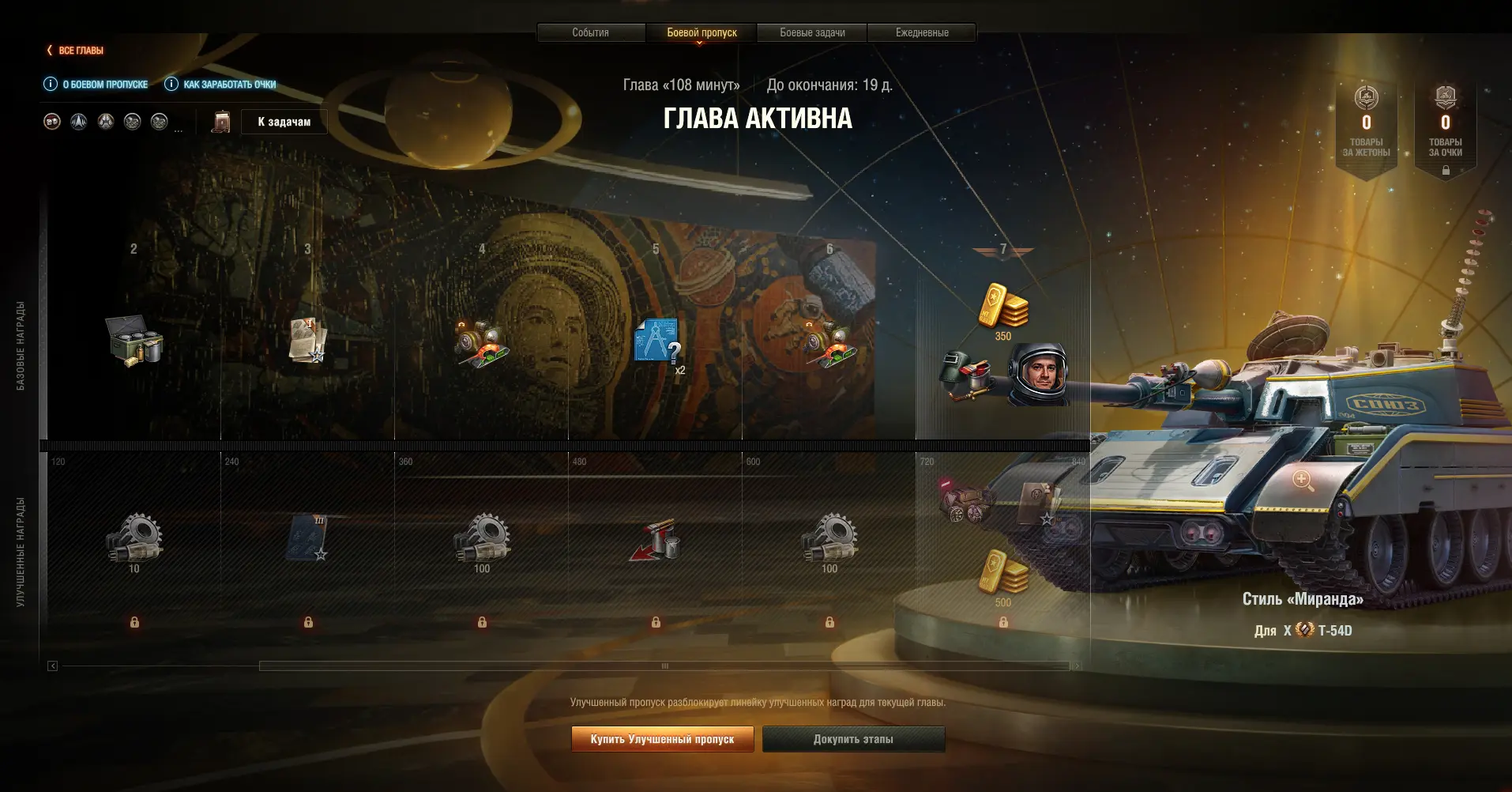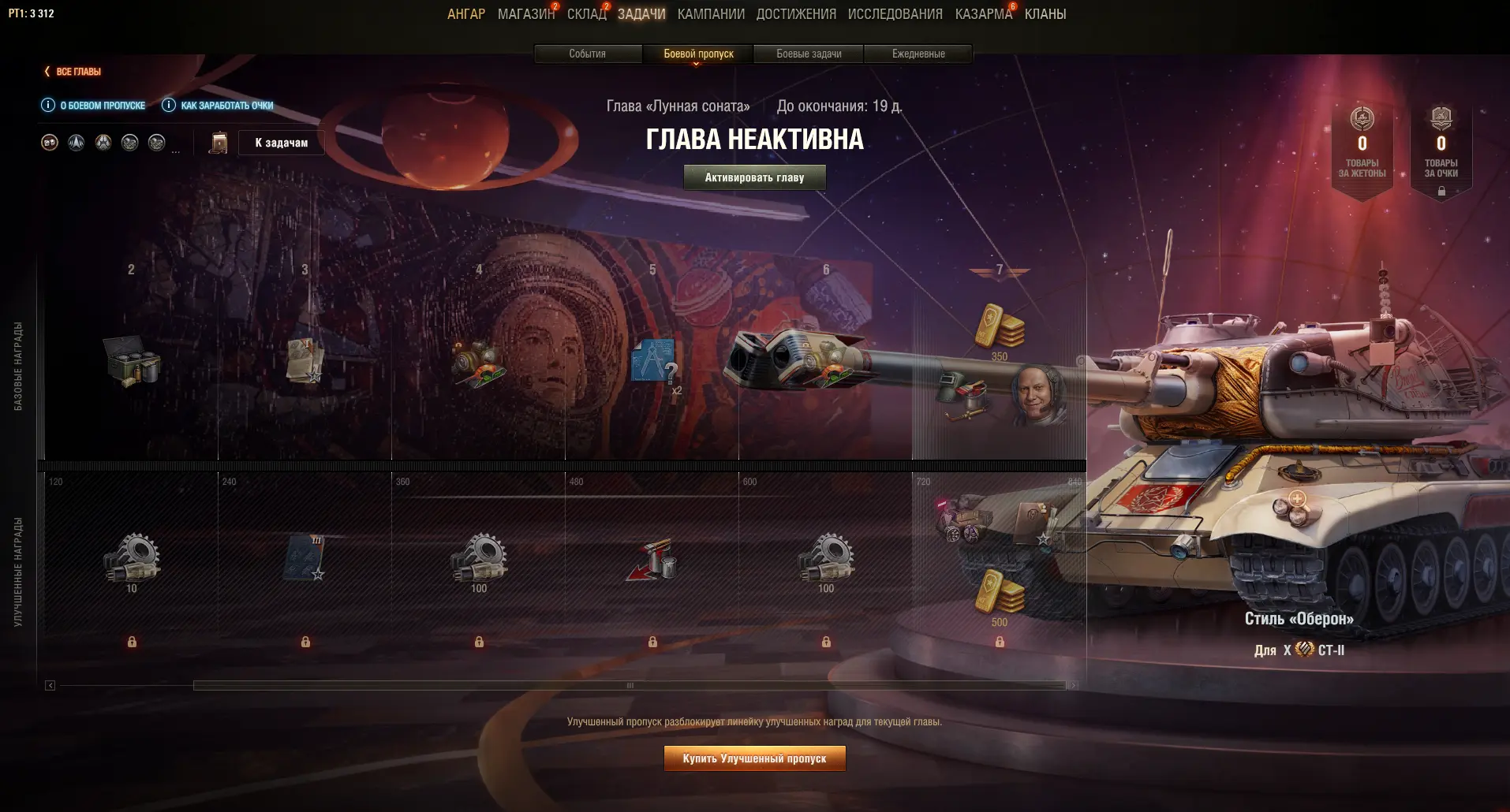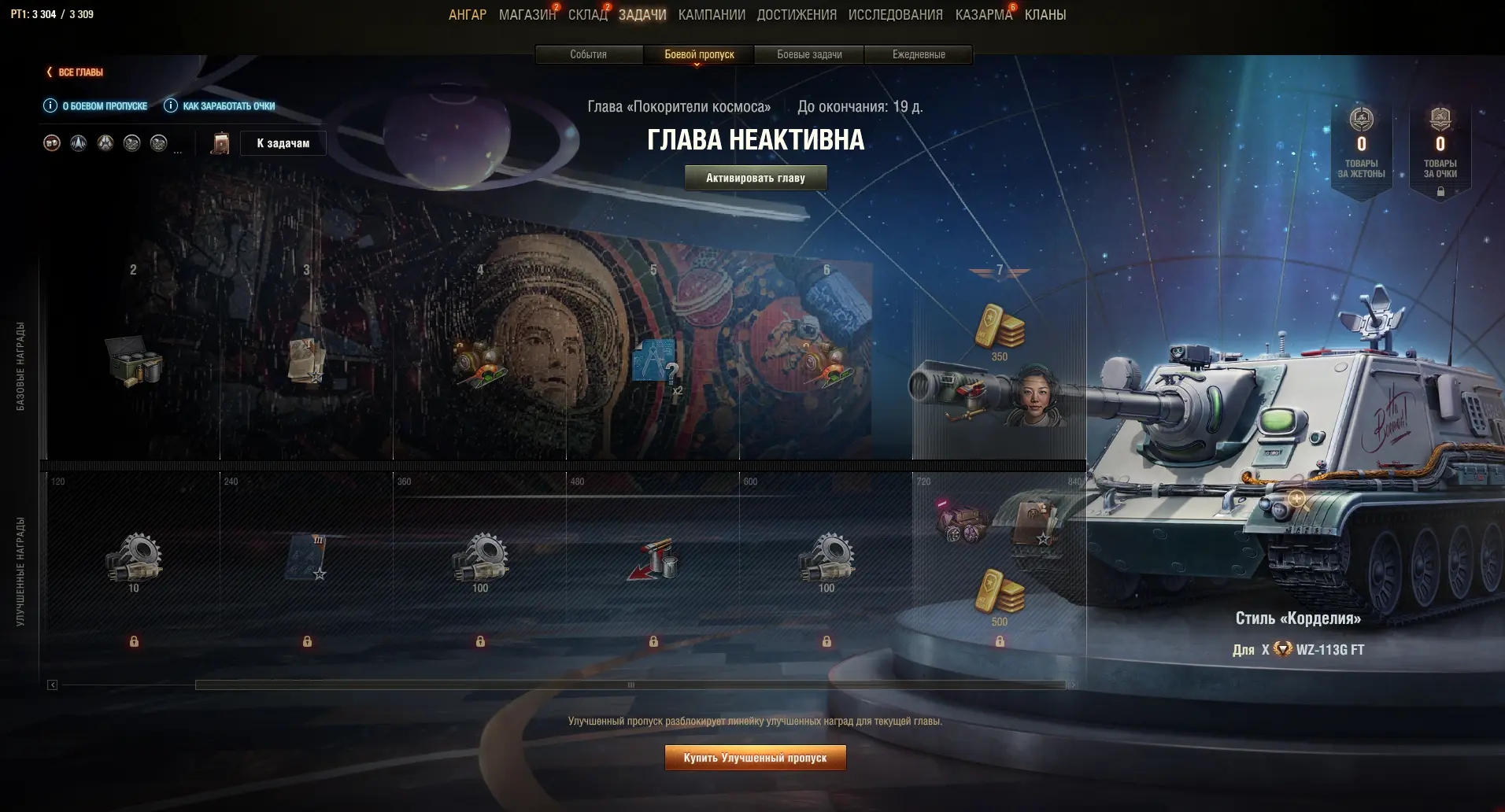 ✅ Улучшенный пропуск для главы можно приобрести за 100 000 свободного опыта или 2 500 золота на экране Боевого пропуска в ангаре.