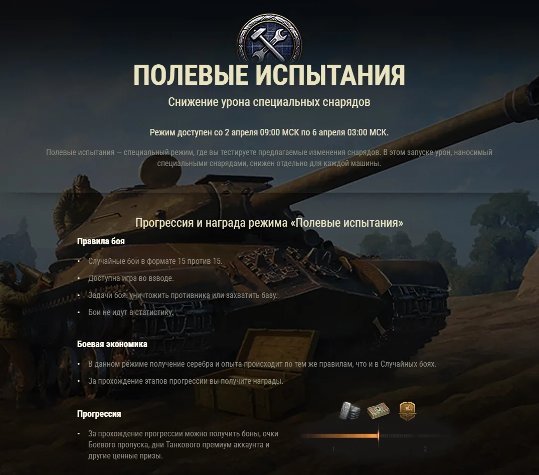 ⚙ Полевые испытания специальных снарядов с 2 по 6 апреля — их урон будет уменьшен.