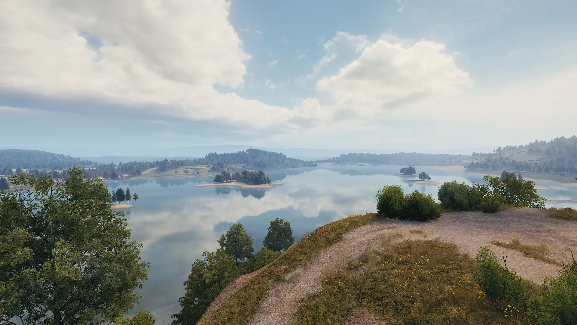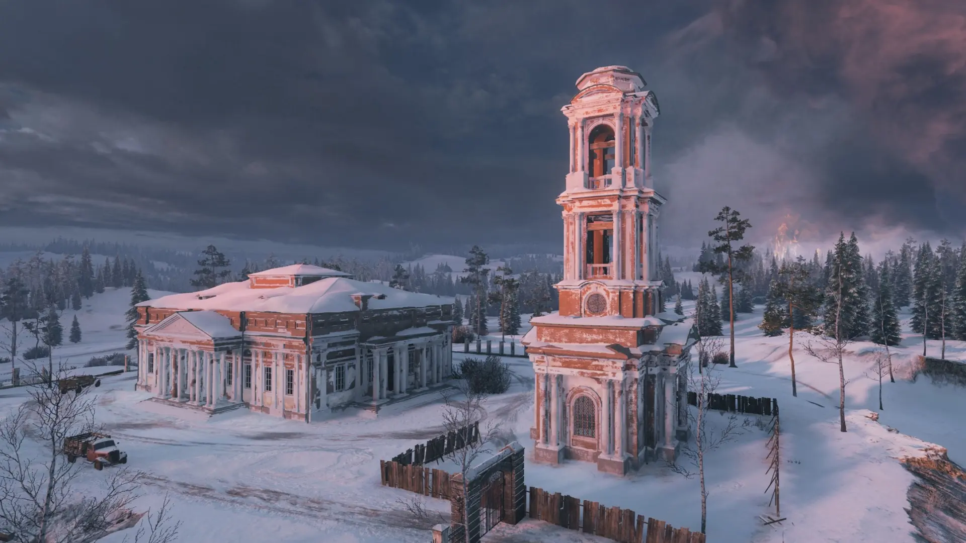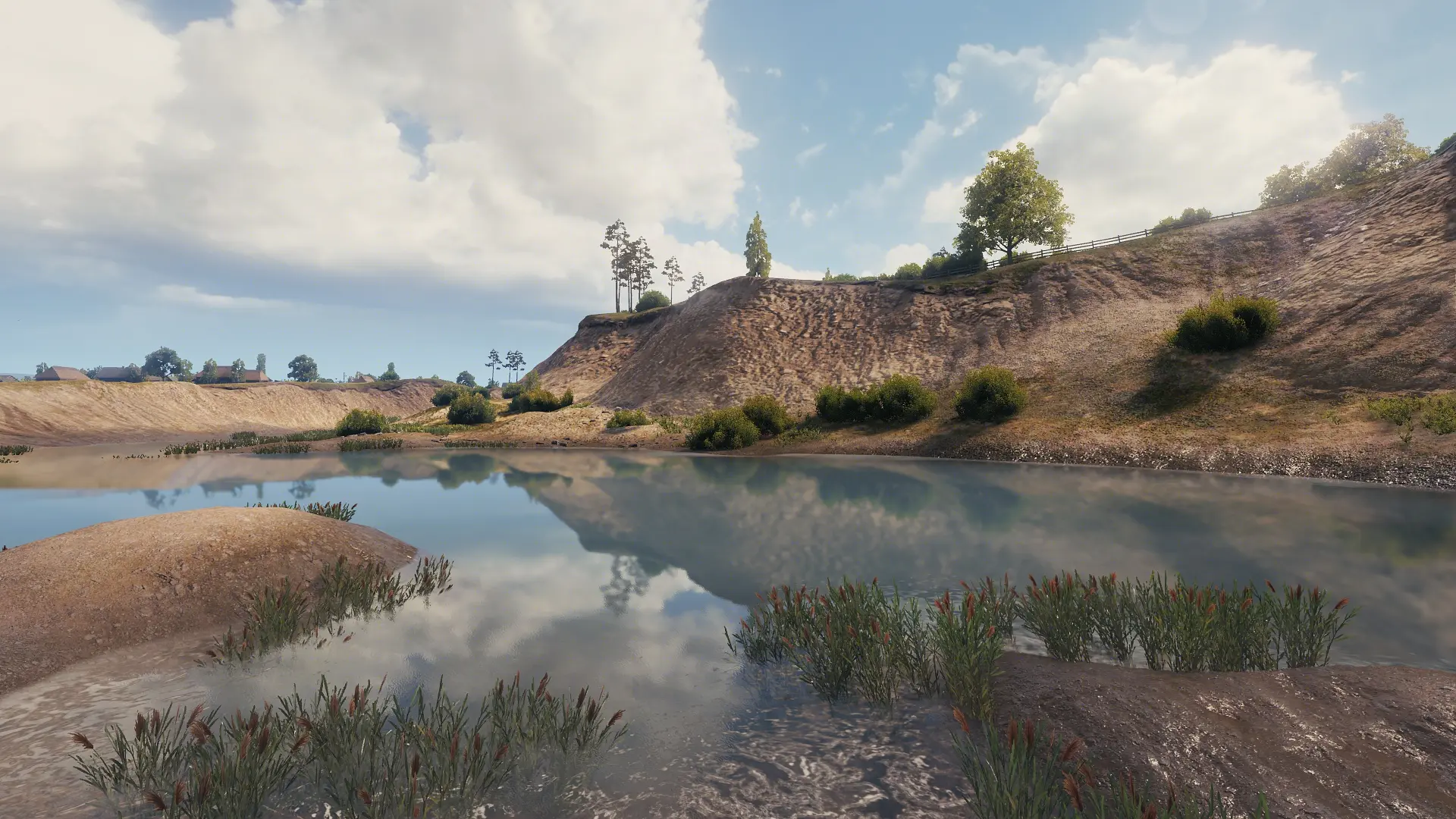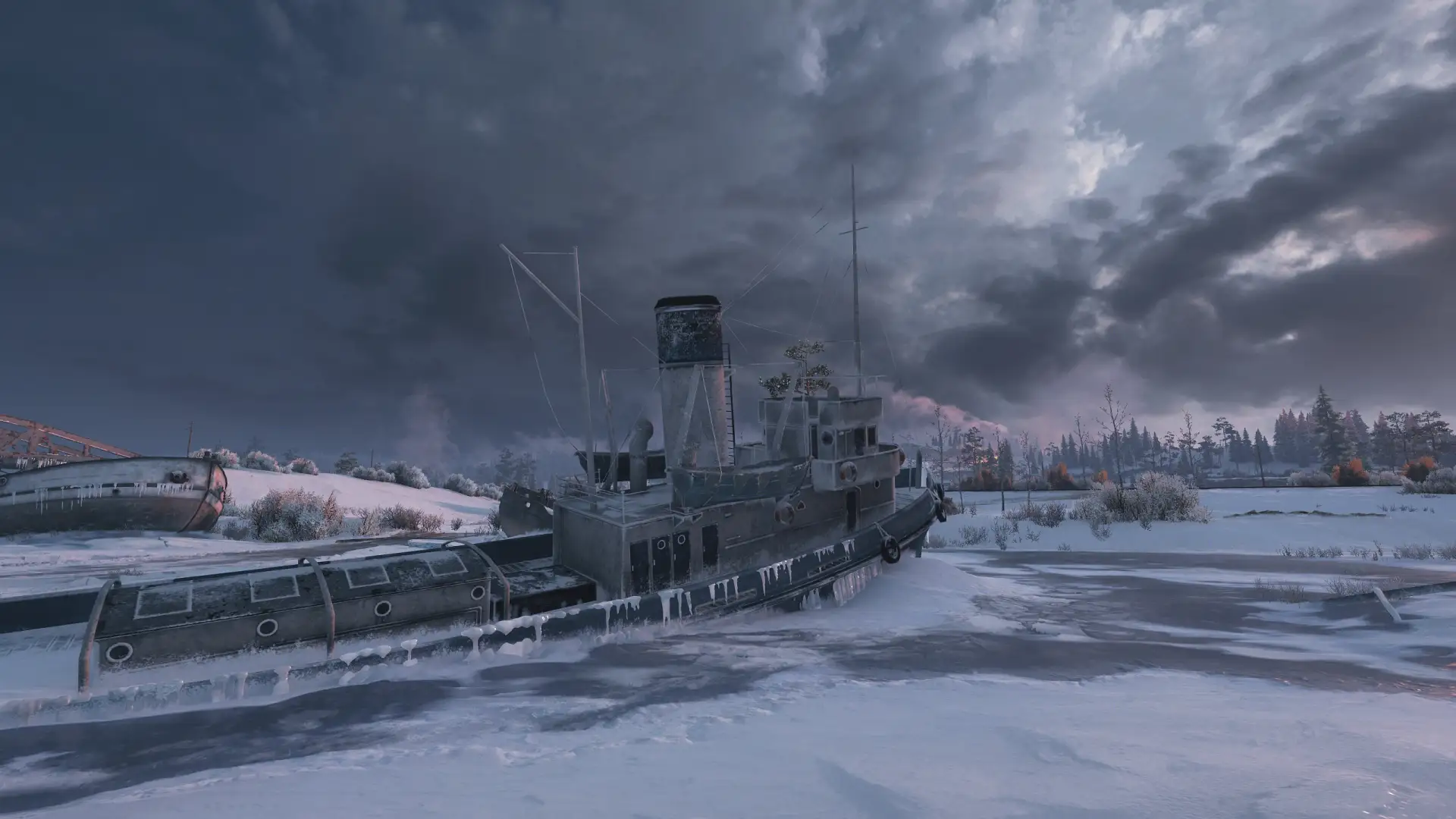 • Река разделяет локацию на две части, соединённые мостом: на одном берегу — плотная застройка, на другом — относительно открытая местность.