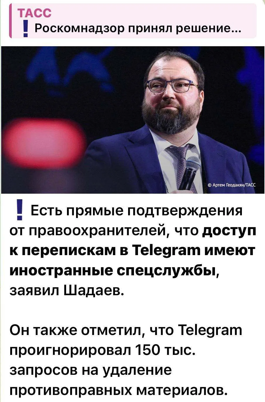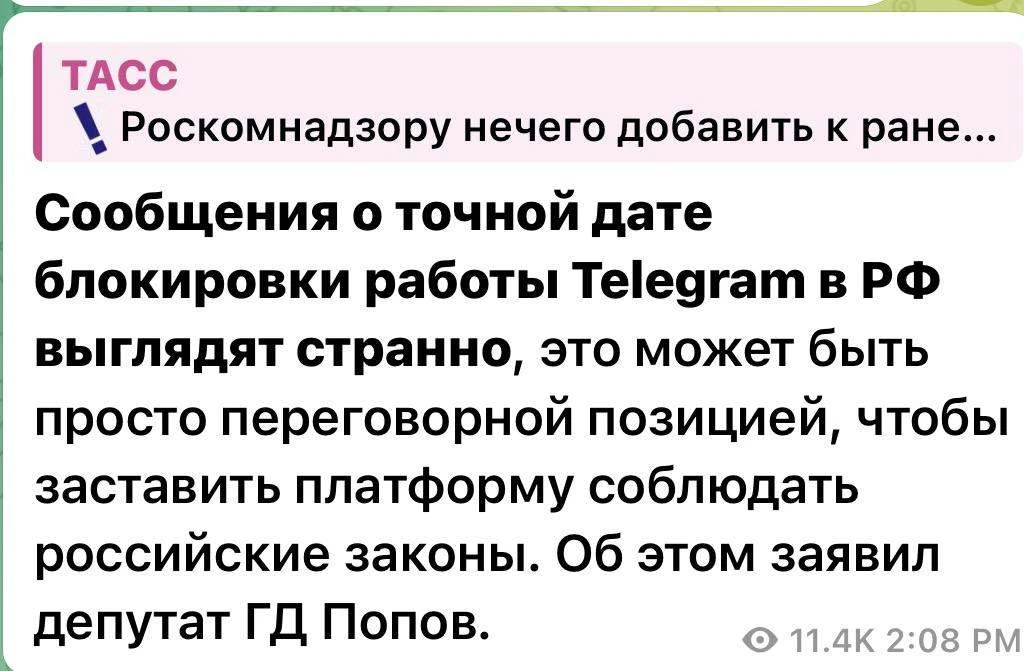 СМИ сообщают о якобы полной блокировке Telegram с 1 апреля, ссылаясь на некие «источники». Официальных комментариев на этот счет пока не было. У меня нет никакой инфо на этот счёт. Мы не принимаем участия в принятии каких-либо решений по ограничению тех или иных платформ.