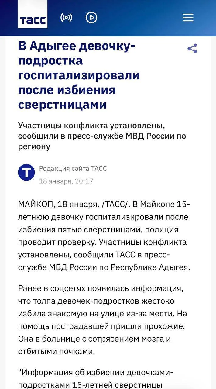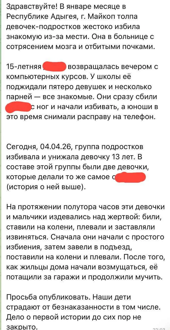 Вчера в Майкопе толпа подростков избила 13-летнюю школьницу возле многоквартирного дома. Девочку избивали больше часа, ставили на колени и заставляли извиняться. Как сообщают СМИ, полиция уже проводит проверку, а прокуратура взяла ход проверки на контроль.