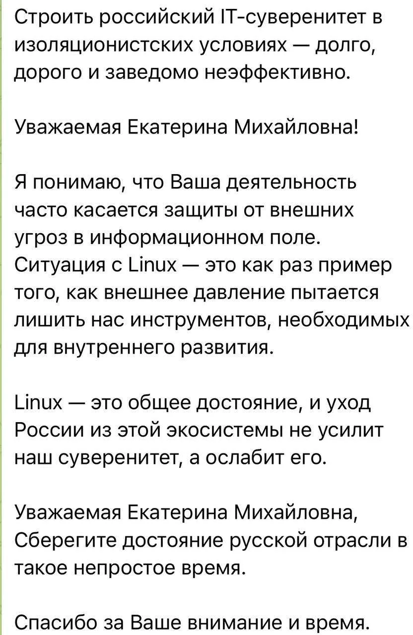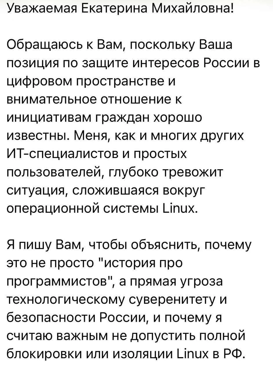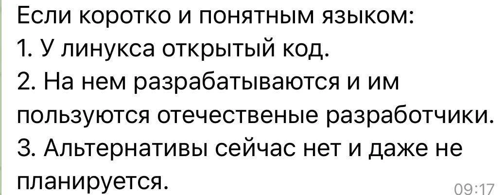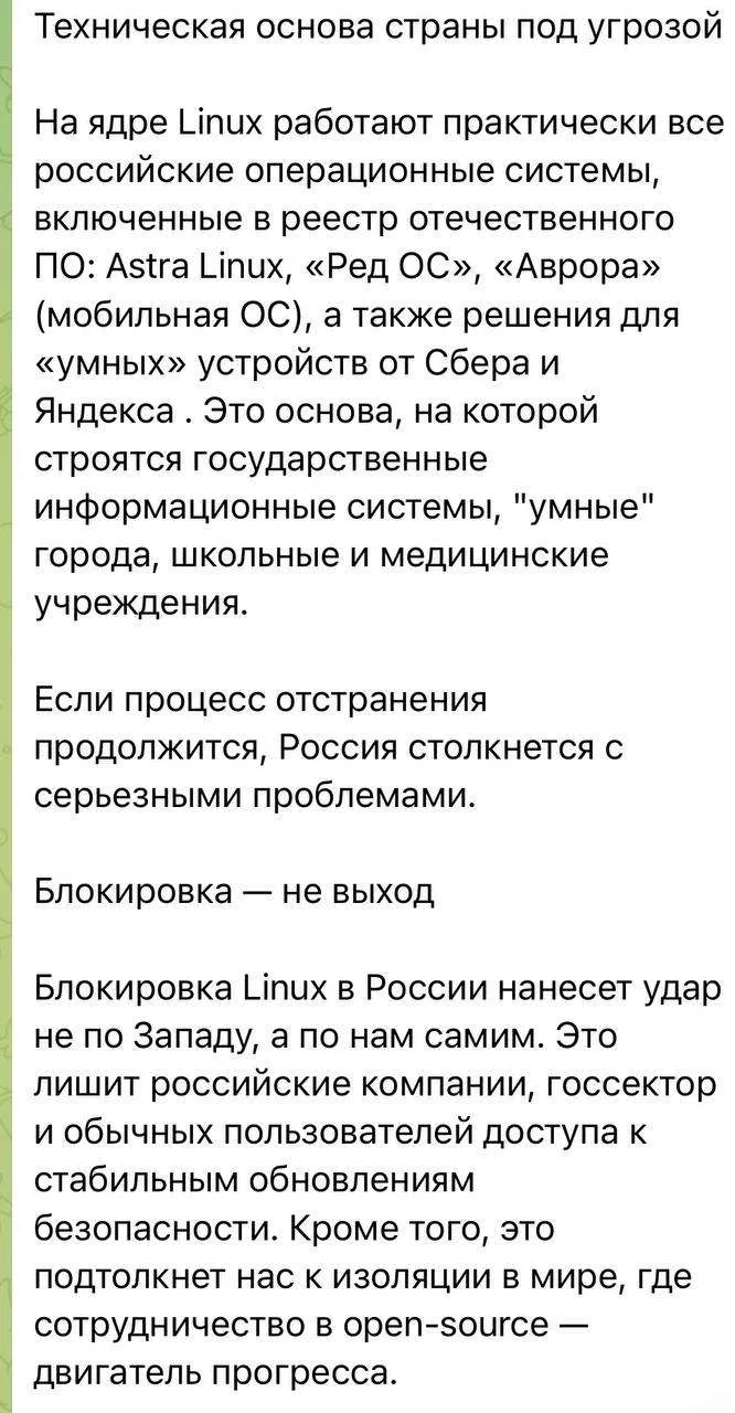Третий день мне пишут IT-специалисты, которые обеспокоены ситуацией вокруг Linux. По их словам, после замедления Telegram, они не могут обновить ядро и теперь им требуется VPN. Как пишут разработчики, на Linux работают практически все российские операционные системы, включенные в реестр отечественного ПО. Кроме того, по неизвестным причинам «легли» сайты с курсами по Python и важные библиотеки для Linux. Все попытки выяснить информацию у Роскомнадзора ни к чему не привели, на письма людям не отвечают.
