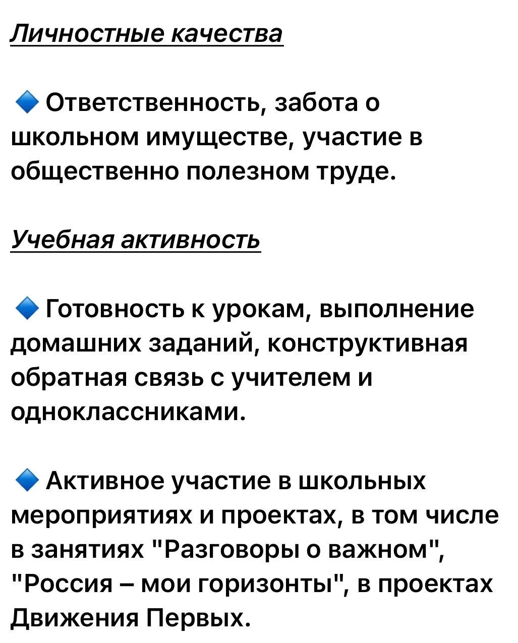 Там и опоздания на уроки, умение работать в команде, участие в общественно полезном труде, активное участие в мероприятиях, в том числе во внеурочке.