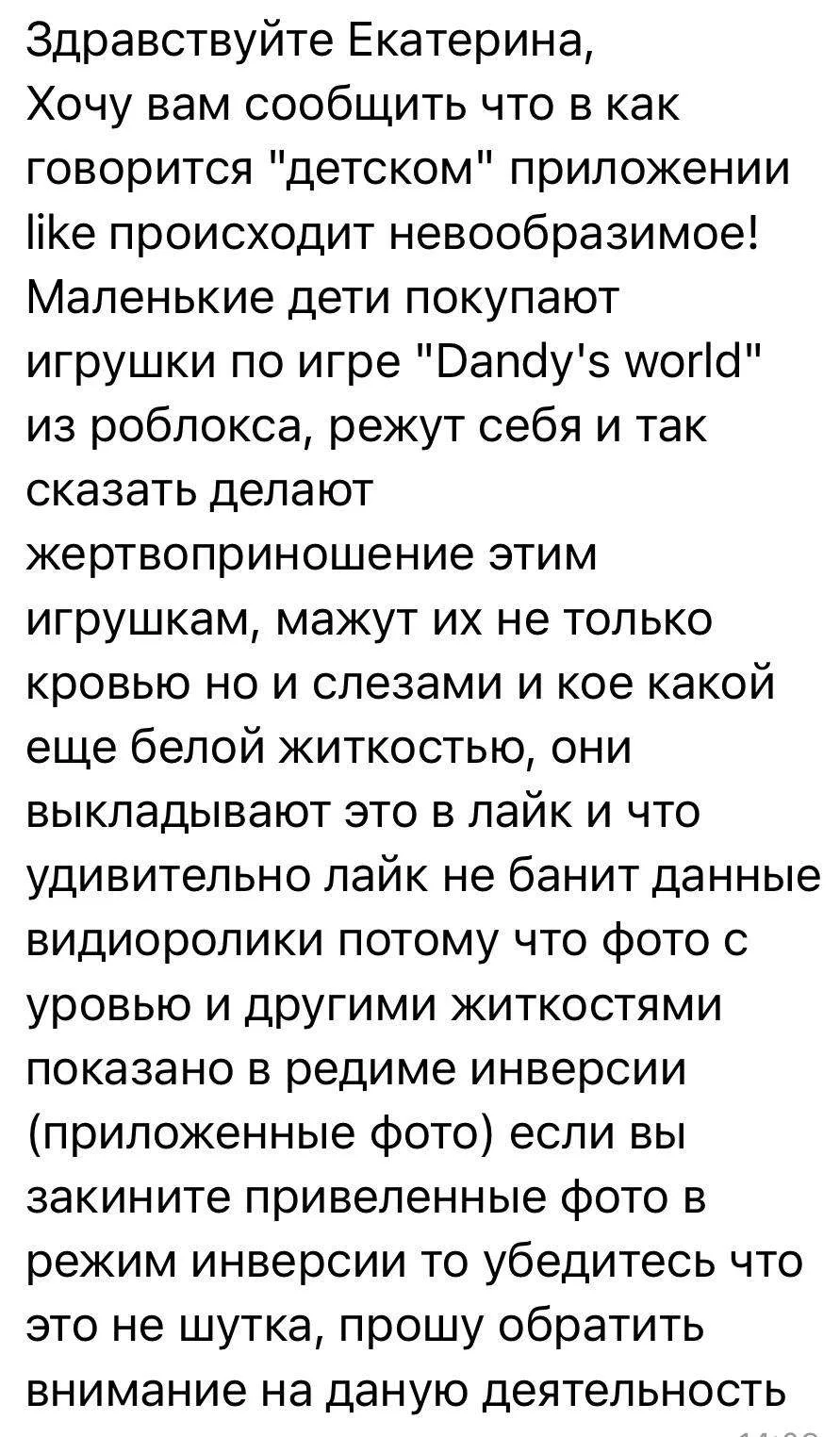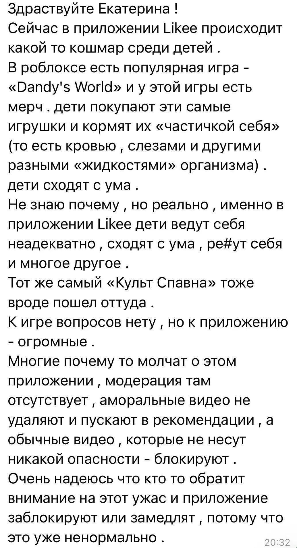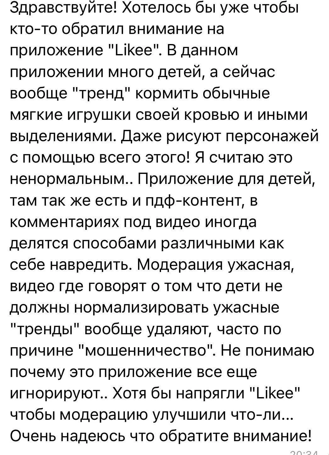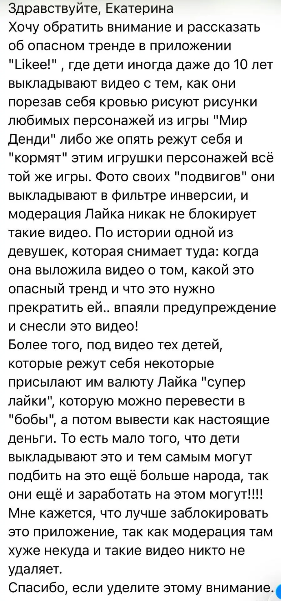 Какая-то очередная жесть в Likee. Там вирусно распространяется странный тренд - маленькие дети покупают игрушки персонажей из игры и кормят их для видео «частичками себя» (собственной кровью, слезами и так далее). Некоторые режут руки прямо на видео. Примеры я показывать не буду. По словам подписчиков, платформа не пресекает распространение такого контента (неудивительно). Кроме того, ряд пользователей нам сообщили о том, что платформы блокирует аккаунты тех лиц, которые пишут им об опасном контенте. Обратимся в Роскомнадзор.