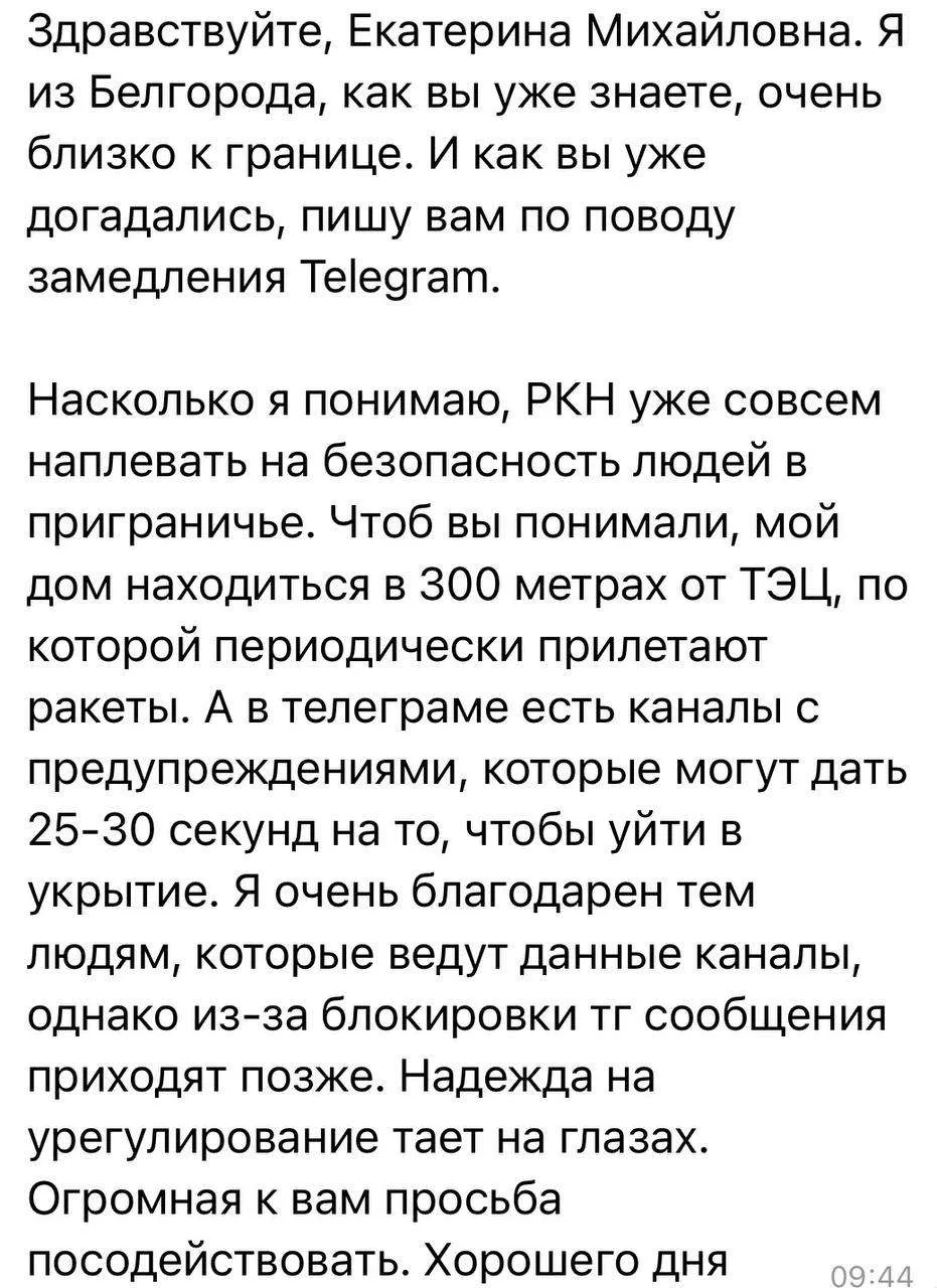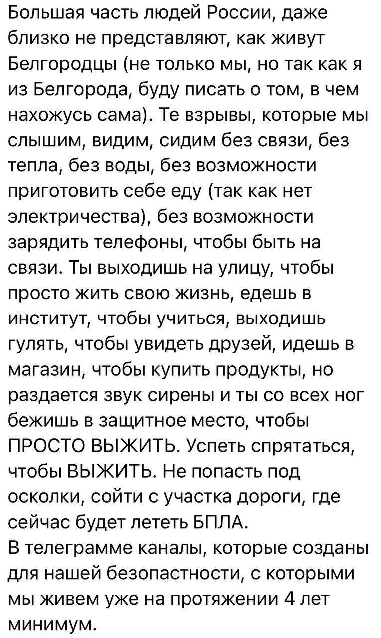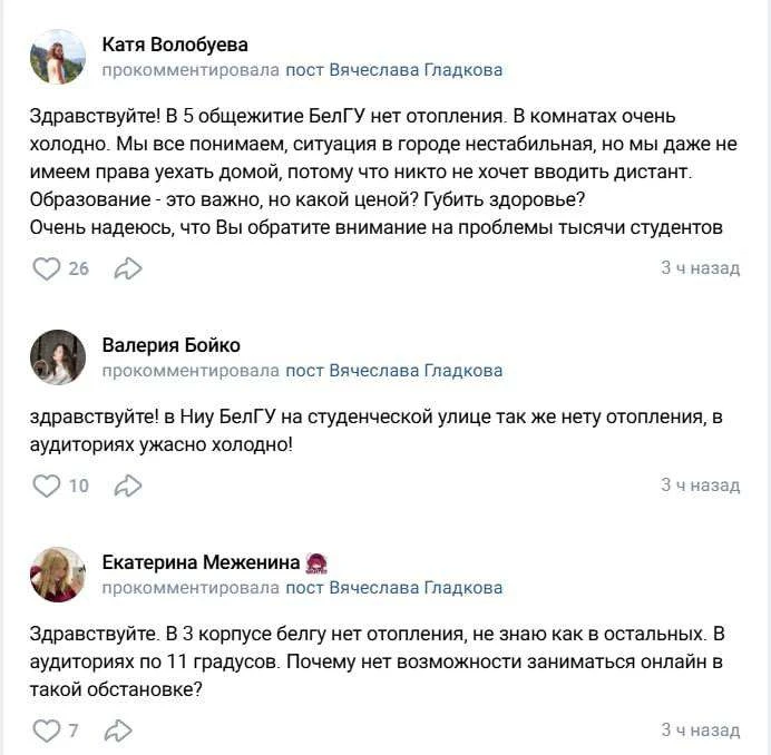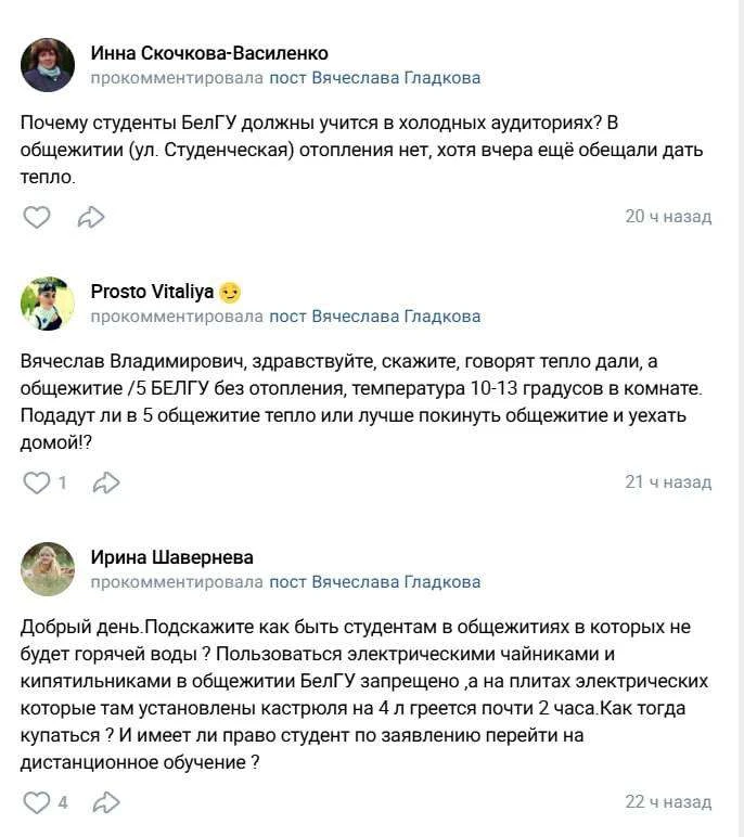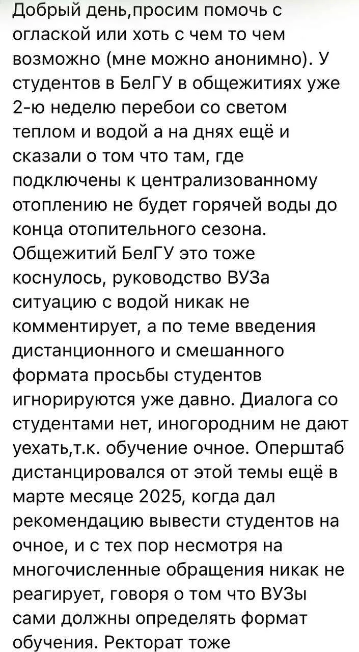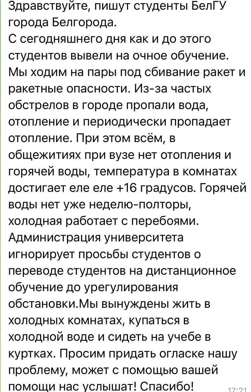 Второй день мне пишут студенты из Белгорода. В силу сложившейся сложной ситуации в регионе с подачей тепла и электричества, в ряде студенческих общежитий отсутствует отопление и горячая вода. В некоторых, по словам ребят, уже несколько недель. Иногородние студенты просят вузы перевести их на дистант, чтобы была возможность уехать домой на время и учиться оттуда. Но пока ответа они не получили