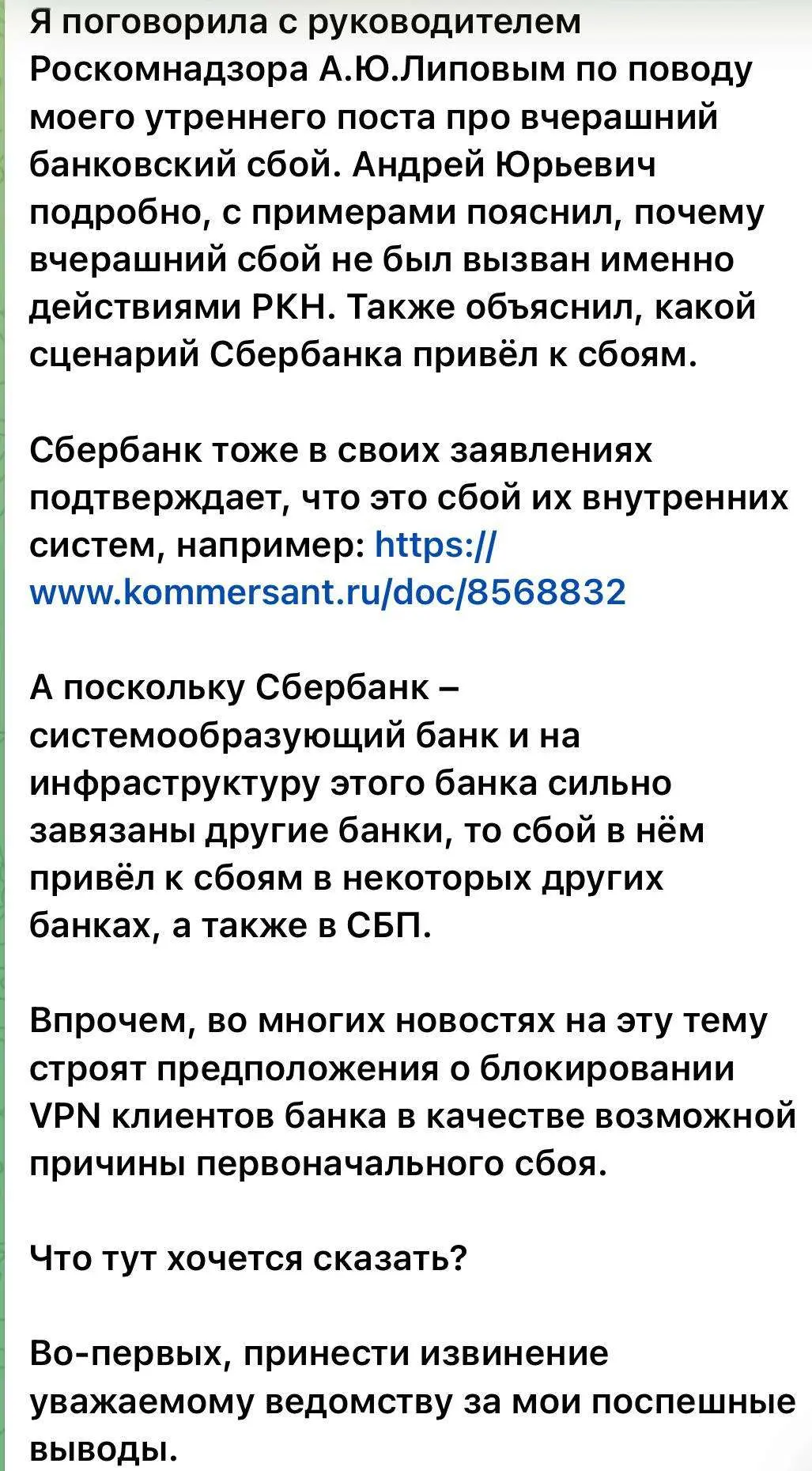 Наталья Касперская извинилась перед Роскомнадзором за то, что обвинила ведомство во вчерашнем сбое банковских систем. По ее словам, она поговорила с руководителем РКН, который пояснил ей, что вчерашний сбой не был вызван их действиями. Проблема была связана со сбоем в Сбере, который повлек за собой сбой у других банков.