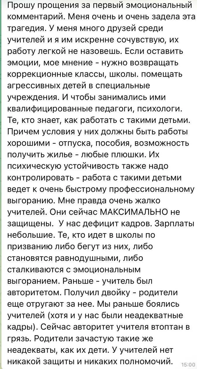 Зачем ждать, пока что-то случится? Не пора ли уже сделать выводы и начать вводить системные меры и исправлять ситуацию для того, чтобы, с одной стороны, оградить и защитить учеников и учителей от таких опасных и неуправляемых подростков, а с другой - вести с ними реальную профилактическую работу, которая будет давать эффект. На деле, а не на бумаге
