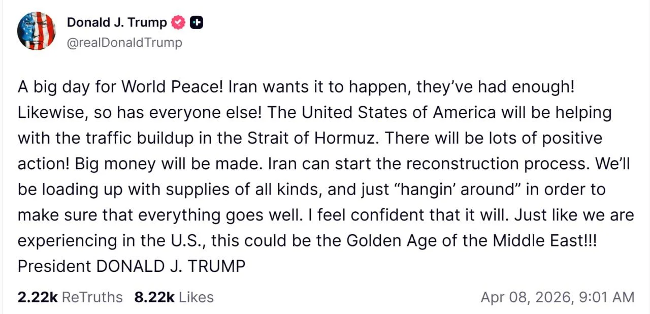 «Я соглашаюсь приостановить бомбардировки и атаку на Иран сроком на две недели. Это будет двустороннее прекращение огня», — отметил президент США.