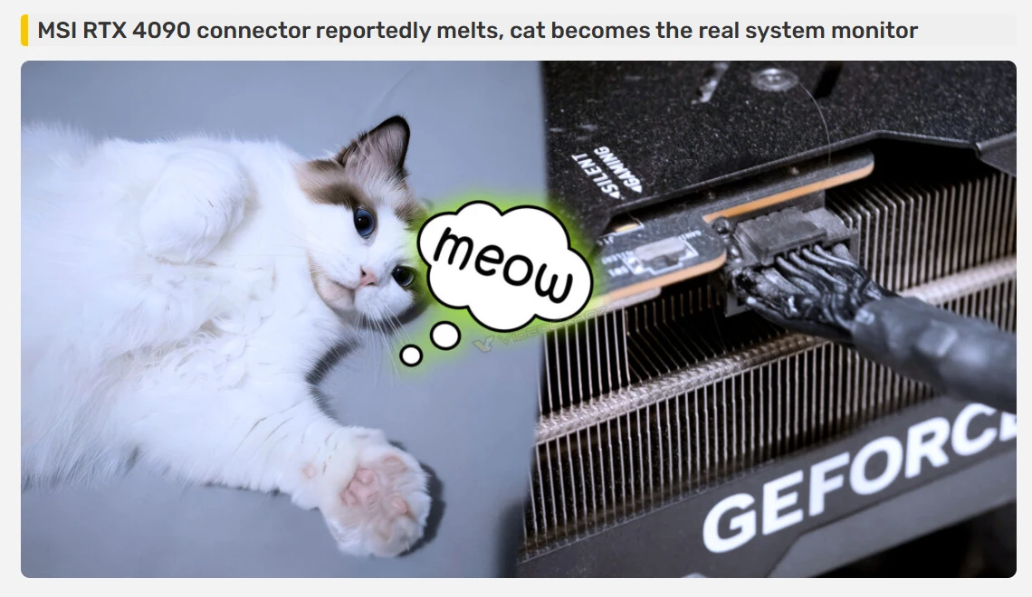 Мужчина оставил включённым компьютер, и видеокарта RTX 4090 начала перегреваться, издавая запах гари. Пушистый питомец учуял опасность и привлёк внимание владельца, который в это время был в ванной.