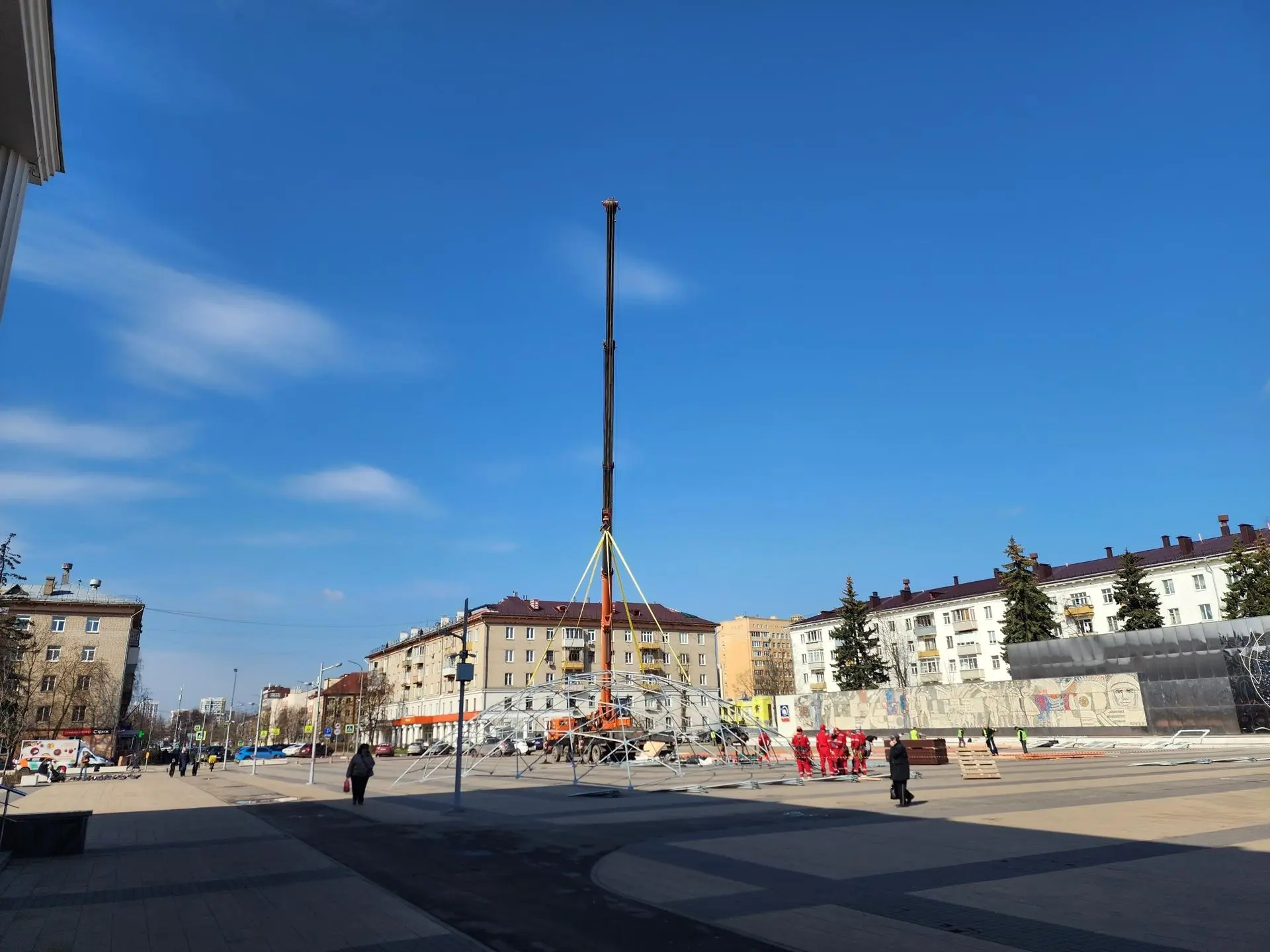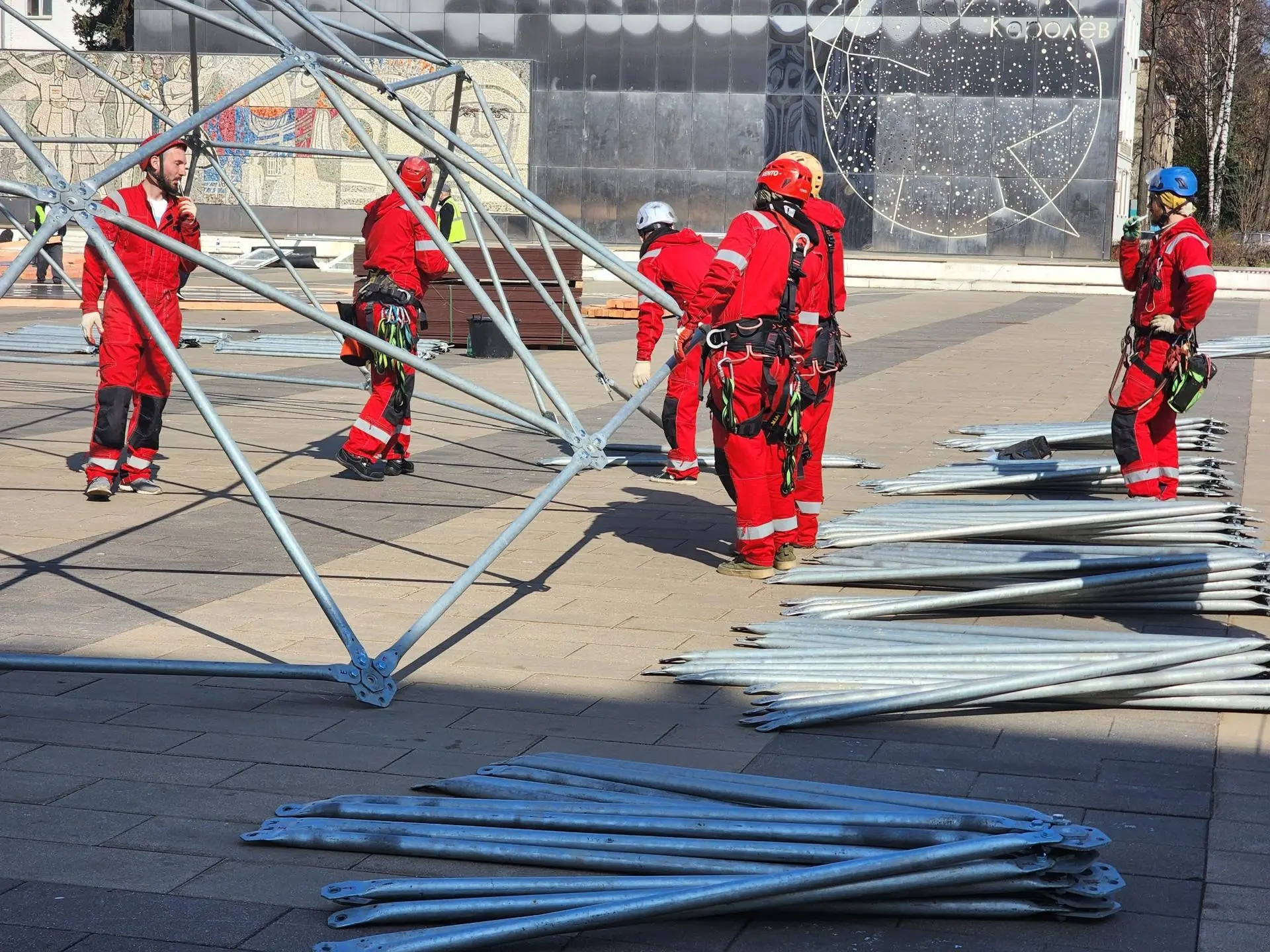 На площади у Дома культуры имени М.И. Калинина монтируют куполы для шатров и макетов планет.