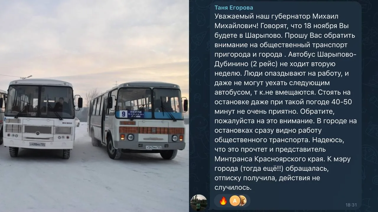 Перед поездкой в Шарыпово получил в комментариях сообщение о перебоях в работе общественного транспорта на маршруте «Шарыпово-Дубинино». Обсудили вчера этот вопрос с главой округа Вадимом Хохловым, поручил ему разобраться с проблемой.