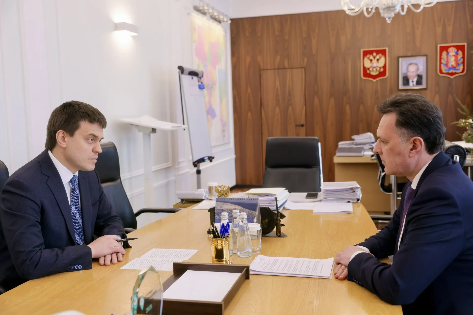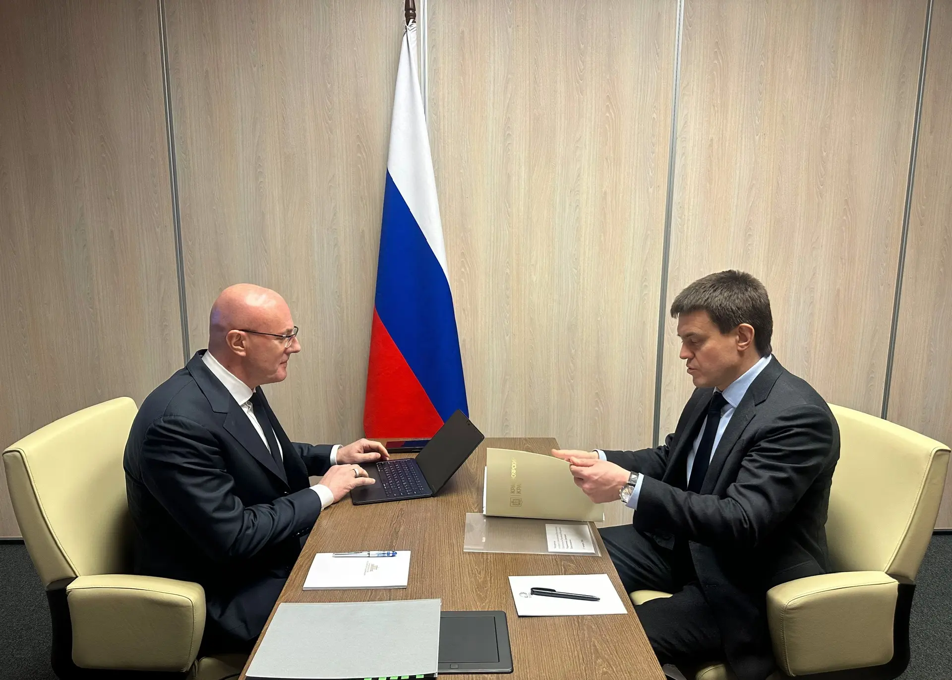 На двухсторонней встрече подвели итоги социально-экономического развития Красноярского края в 2025 году, а также наметили дальнейшие шаги по выполнению задач, поставленных Президентом, в том числе - развитие креативной экономики, а также повышение производительности труда.