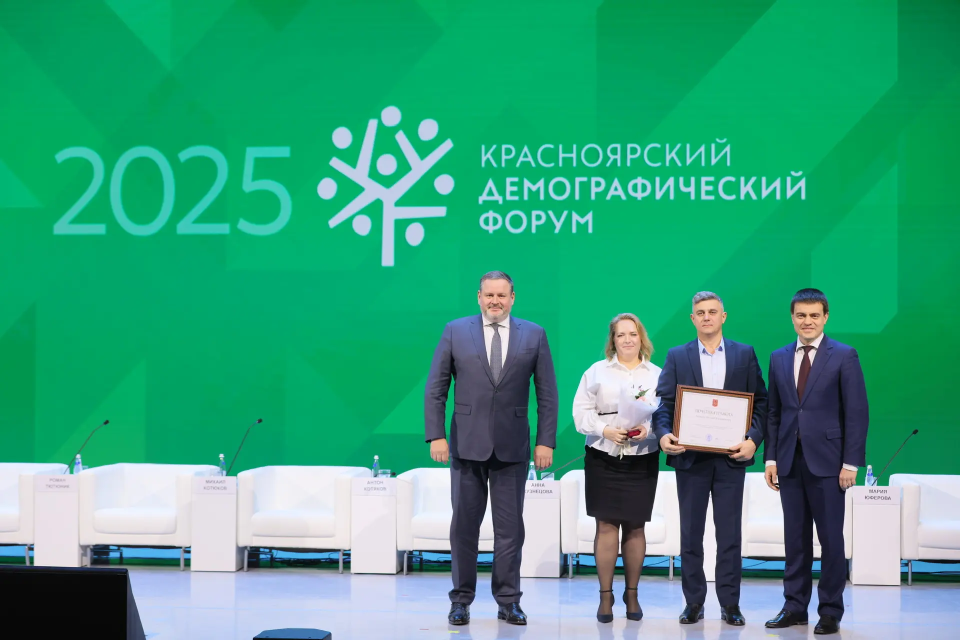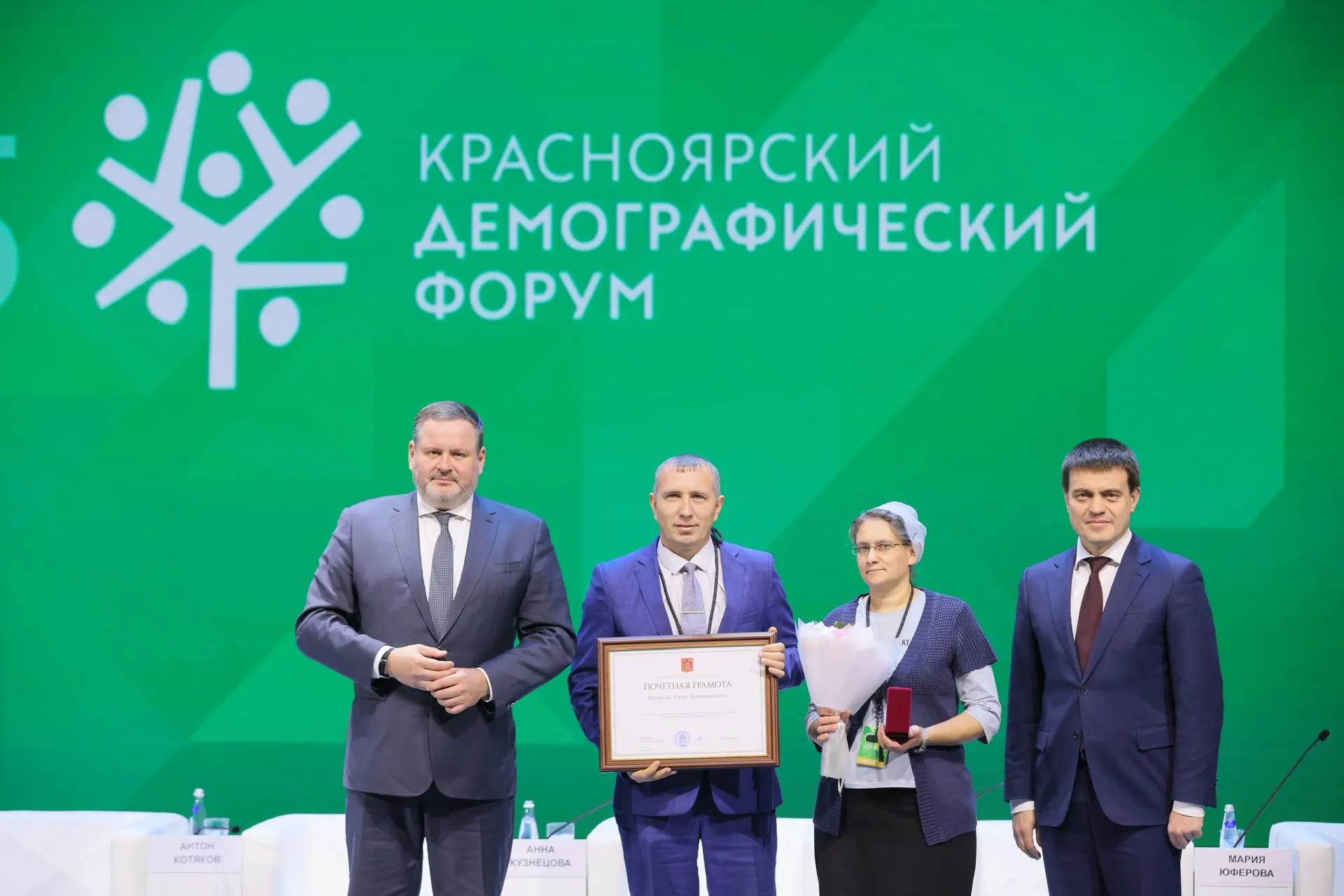 Поздравили матерей и отцов вместе с министром труда и социальной защиты России Антоном Котяковым на демографическом форуме, который проходит в Красноярске.