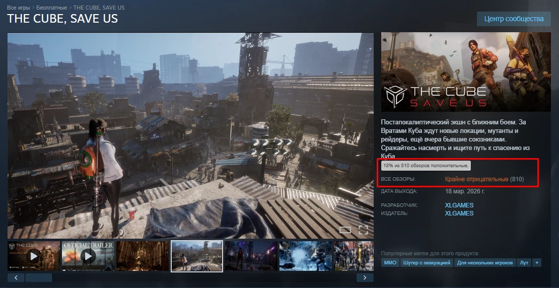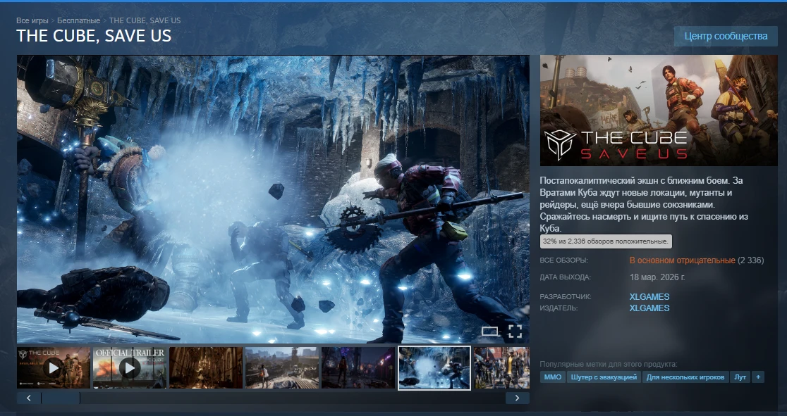 🔥 Не прошло и 2 месяца. XLGAMES закрывает экшен/выживание THE CUBE, SAVE US. Сервера отключат 8 мая. В первый день выхода игра получила всего 19% положительных отзывов в Steam. Игрокам не понравилось ВСЁ. Пиковый онлайн с 5.000 игроков всего за несколько недель опустился до 300.