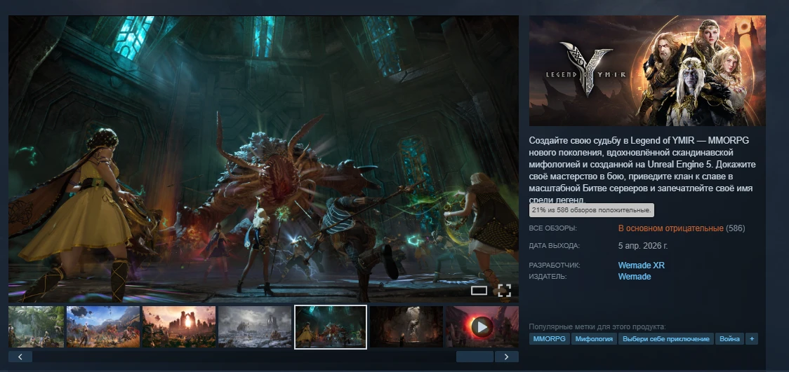 🔥📺 21% из 571 обзоров положительные. Но онлайн пока держится в районе 6000 игроков. Речь про Legend of YMIR в Steam. Релиз состоялся 7 апреля, включая на русском языке.