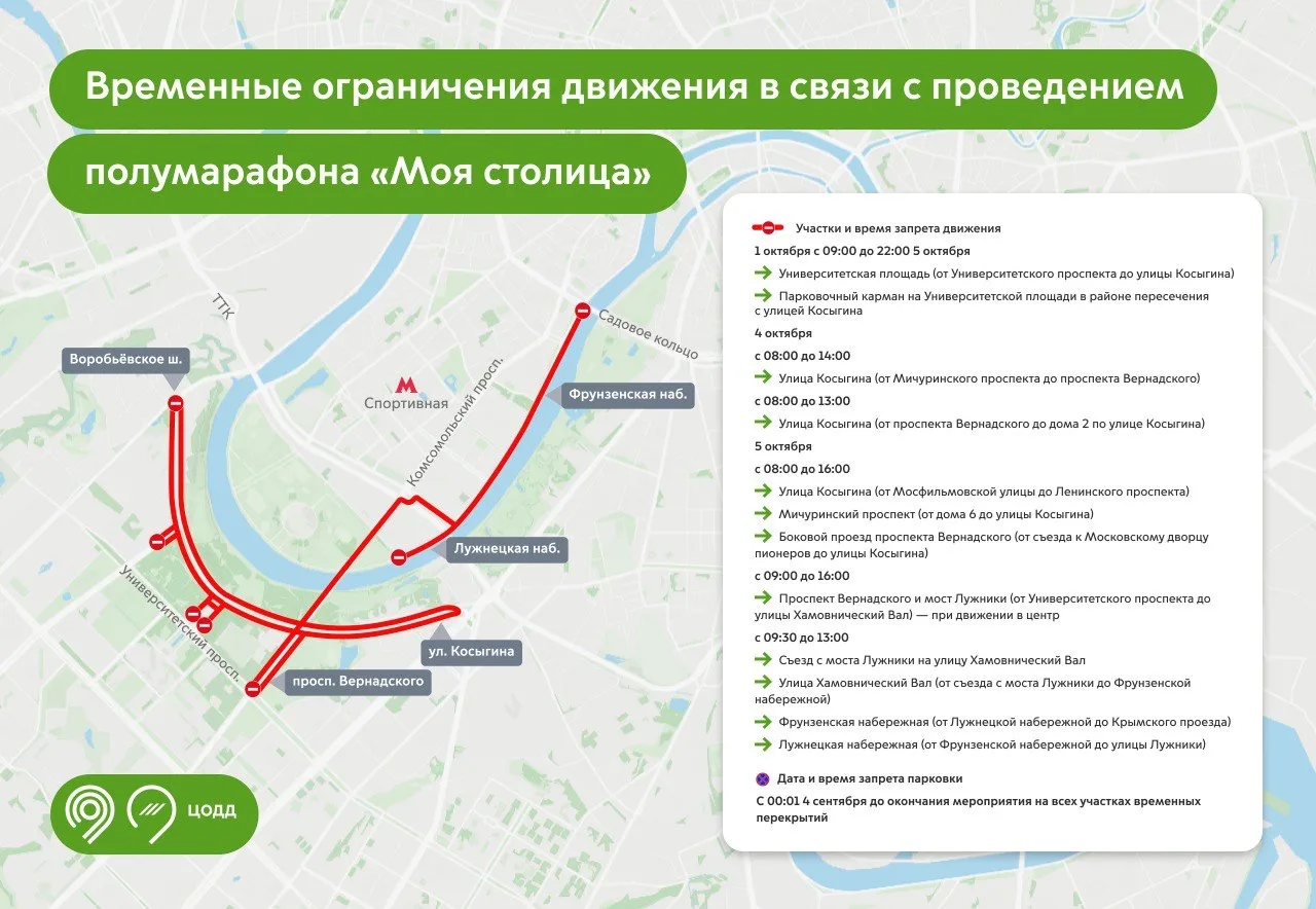🔺5 октября с 09:30 до 13:00 на съезде с моста Лужники, на улице Хамовнический Вал, Фрунзенской и Лужнецкой набережных.