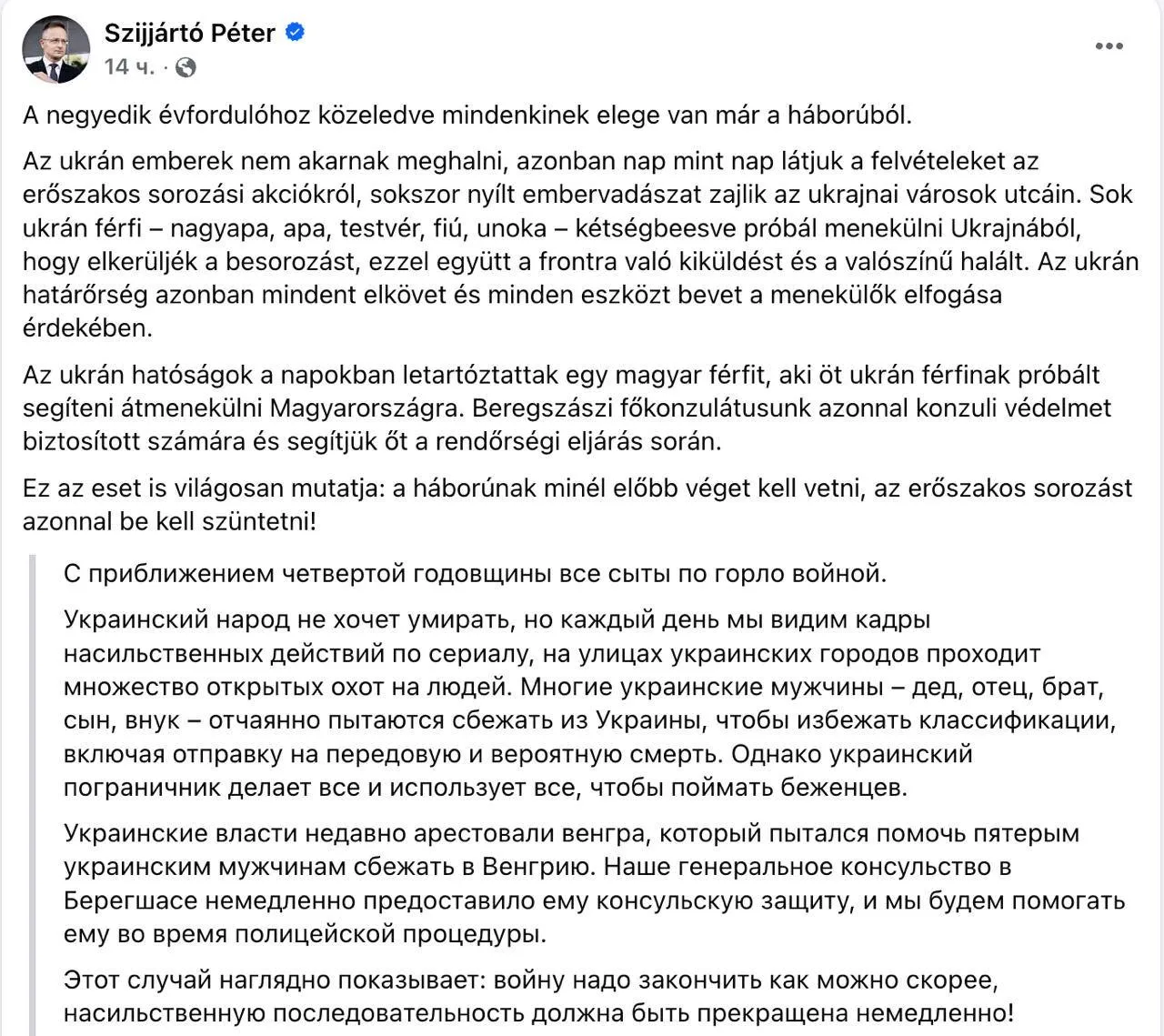⚡️В Украине происходит «охота на людей», заявил глава МИД Венгрии Сийярто касательно мобилизации.