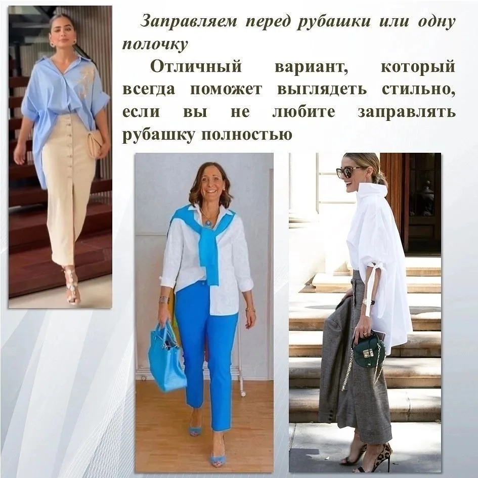 ✅Самостоятельно – просто навыпуск, навыпуск с ремнем, заправляя в низы, заправляя только перед рубашки или одну полочку, завязывая её на талии.