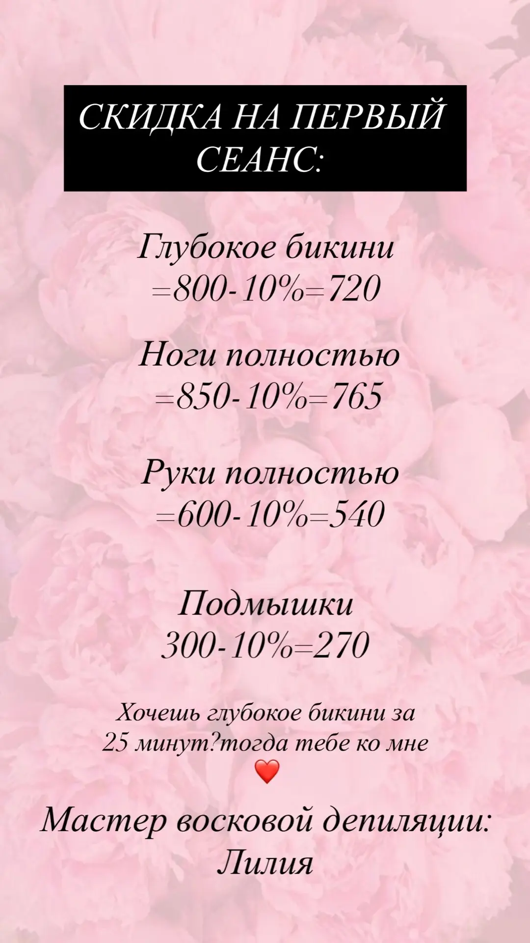 Меня зовут Лилия , я мастер по восковой депиляции с большим опытом работы (5 лет ). Люблю помогать своим клиентам чувствовать себя уверенно и комфортно. ❤️