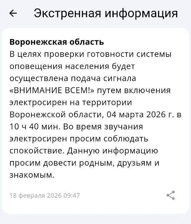 ❗️Сирены прозвучат в Воронежской области 4 марта