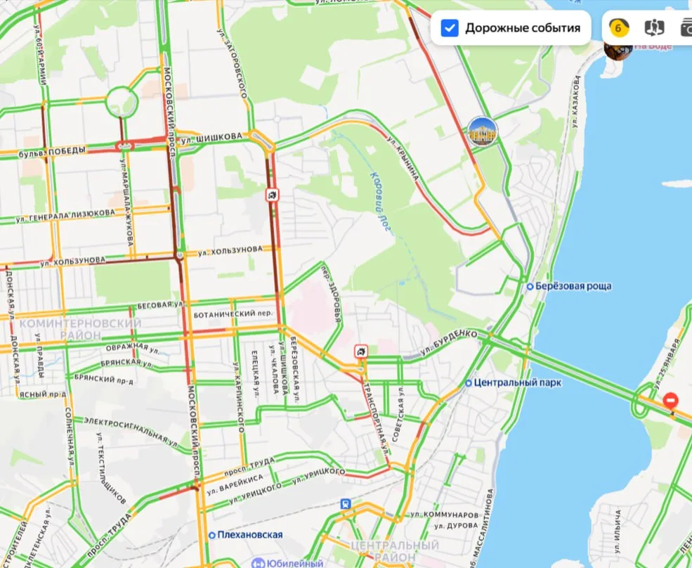 Тяжёлая обстановка и на улицах Шишкова и Крынина. В центре города движение также затруднено, а вот на левом берегу пока пробок не замечено.