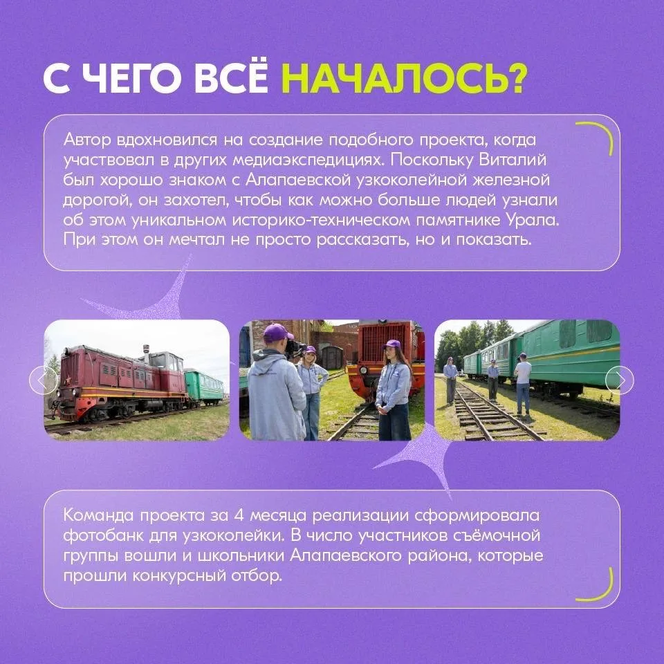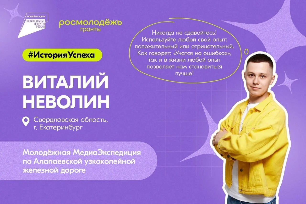 Его проект, посвящён памятнику Свердловской области — знаменитой узкоколейной железной дороге. Проект был поддержан в рамках конкурса Росмолодёжь.Гранты.