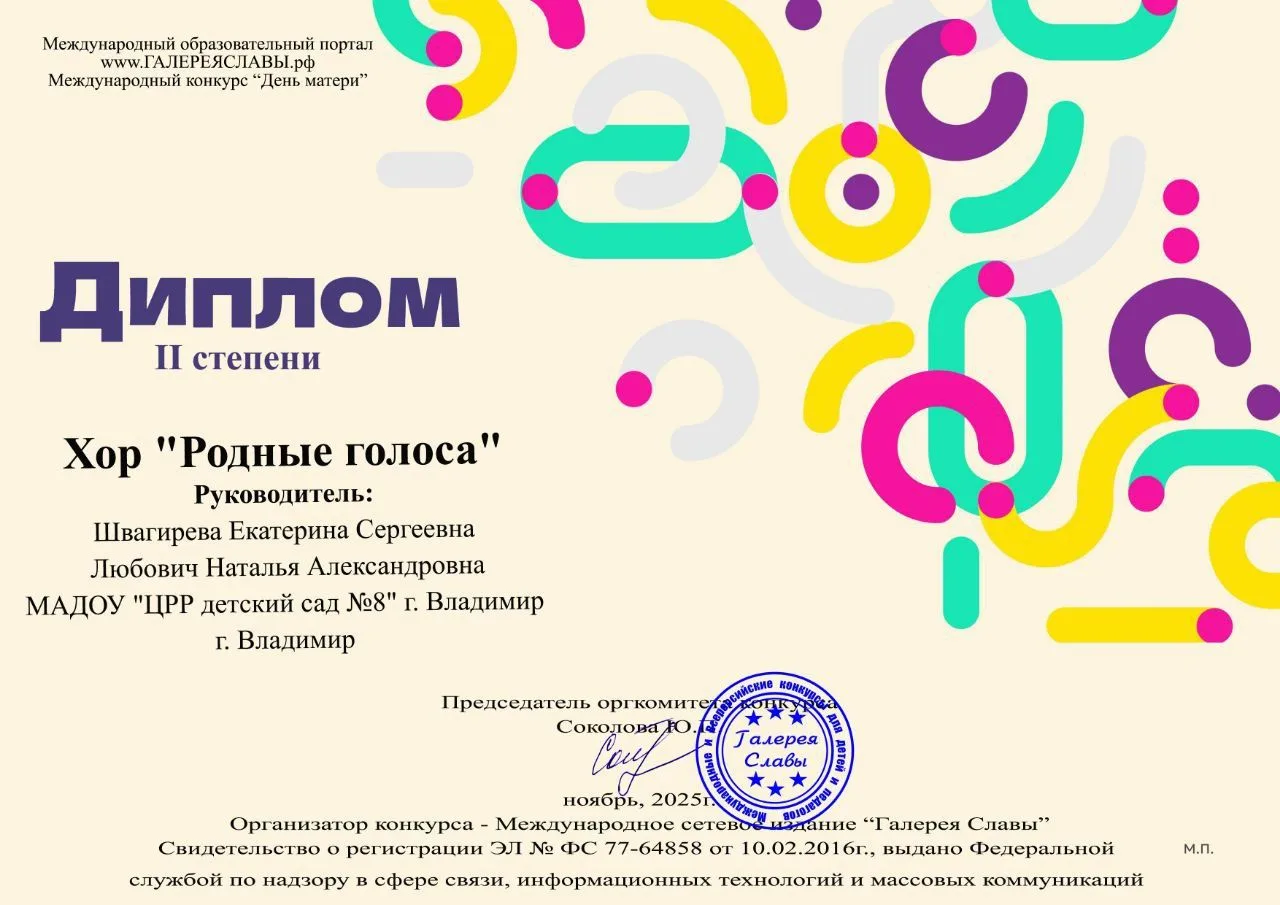 Хор «Родные голоса» МАДОУ ЦРР детский сад 8 под руководством Екатерины Швагиревой отмечен дипломом II степени в рамках Международного конкурса "День матери". Конкурс был организован Международным сетевым объединением "Галерея Славы" и проходил в ноябре. Наш хор представил новую композицию - песню «Мама» (слова и музыка Олег Газманов).