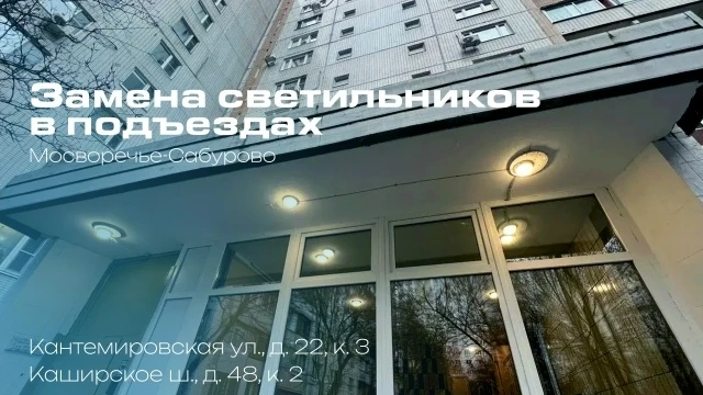 В рамках программы «Приведение в порядок подъездов многоквартирных жилых домов» в районе Москворечье-Сабурово в подъездах домов по адресам: Кантемировская ул., д. 22, к. 3, Каширское ш., д. 48, к. 2 провели замену ламп на светодиодные светильники, которые потребляют на 50–70% меньше электроэнергии, чем лампы накаливания, и служат до 100 000 часов.