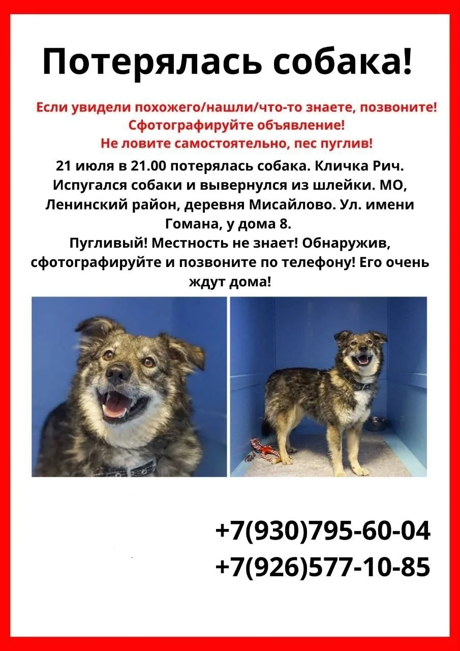 Мышкин, дома ставший Ричем, 21 июля в 21.00 на прогулке сильно испугался другой собаки и вывернулся из амуниции. МО, Ленинский район, деревня Мисайлово. Потерялся на улице им. Гомана, у дома 8. Пристроен недавно, местность не знает. Пугливый, к незнакомым не пойдет!