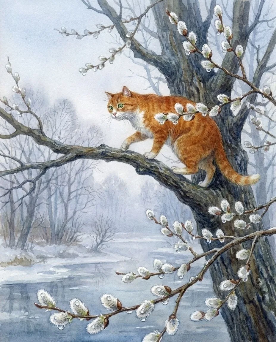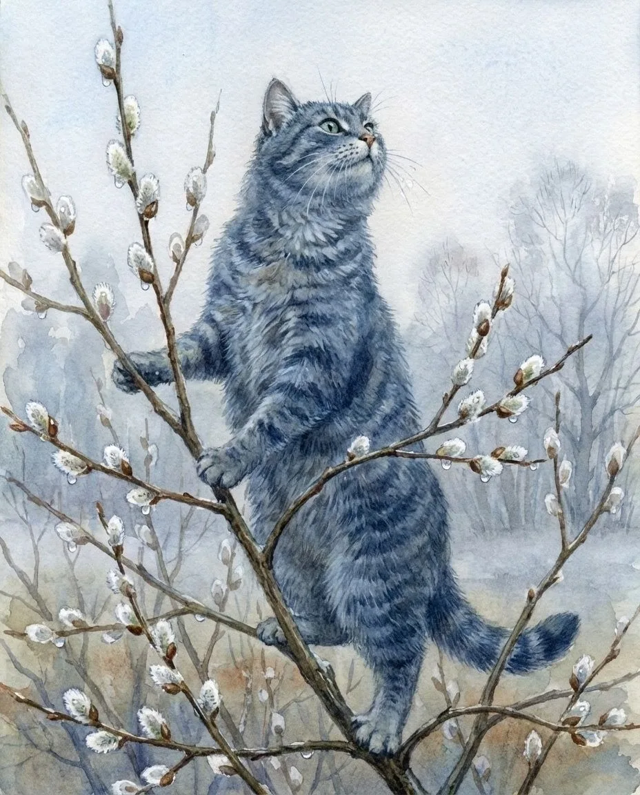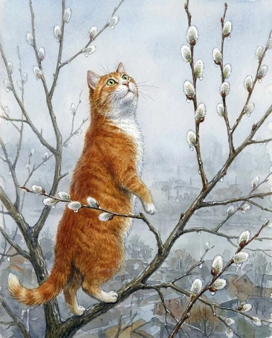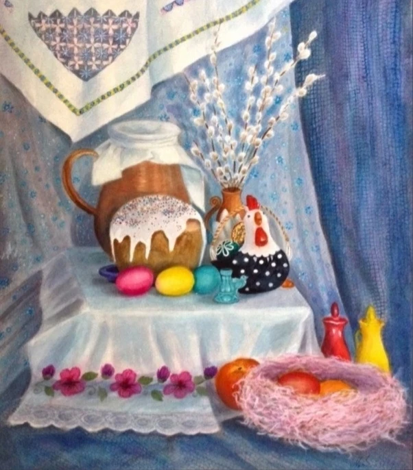 На столе лежали душистые куличи с розовыми бумажными цветами, красные яйца и разбросанные прутики вербы. Все это освещалось солнцем, и до того стало весело мне, что я запел: