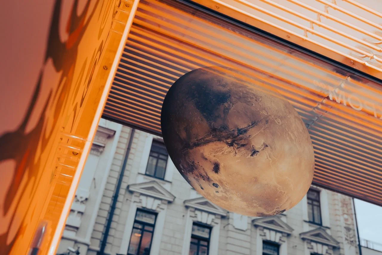 Подходя к нашим магазинам на Малой Никитской, в Екатеринбурге и Санкт-Петербурге, вы увидите стикеры с главными космическими символами — ракетой, Землей и Марсом, который стал основой нашей коллаборации.