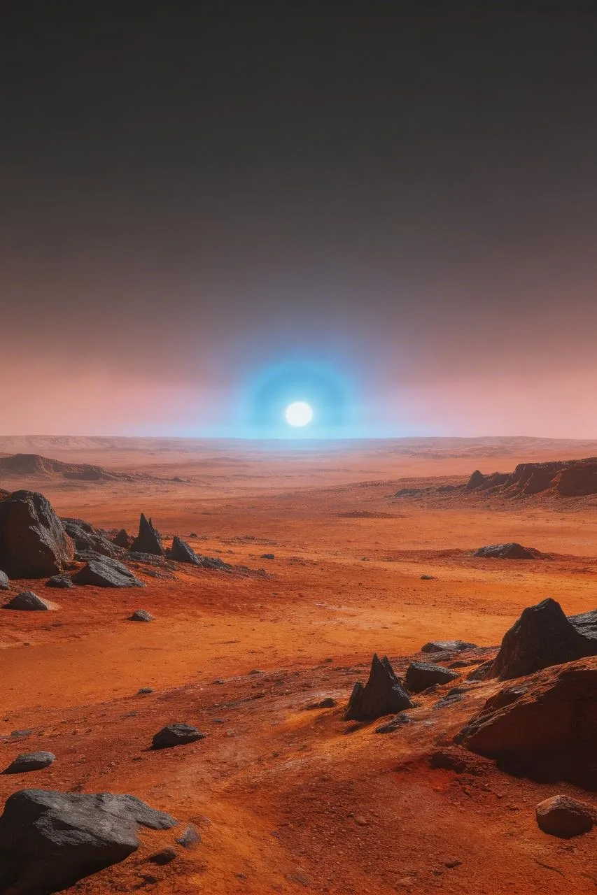 Из-за тонкой атмосферы и пыли в воздухе свет рассеивается иначе, чем на Земле — поэтому вместо привычных теплых оттенков небо становится холодно-голубым.