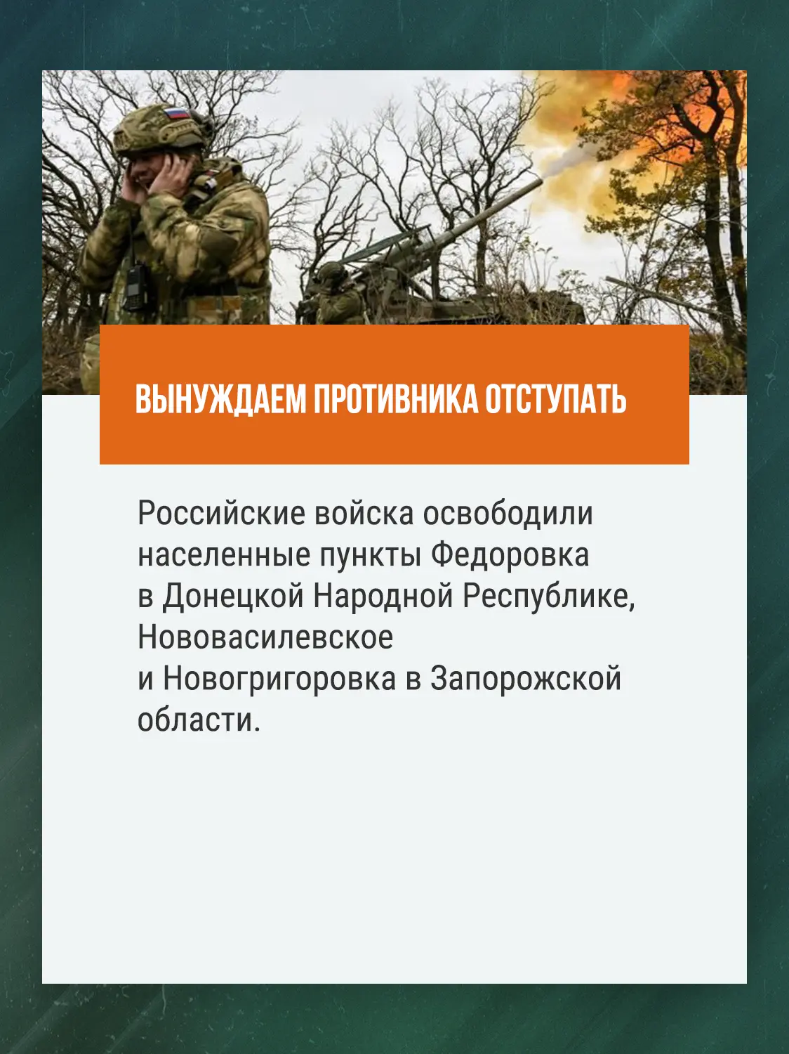 📍 Подразделения группировки войск «Восток» продолжили продвижение в глубину обороны противника. Нанесли поражение формированиям двух механизированных бригад, штурмового полка ВСУ и бригады теробороны в районах населенных пунктов Новониколаевка, Полтавка, Привольное, Успеновка Запорожской области, Вишневое и Даниловка Днепропетровской области.