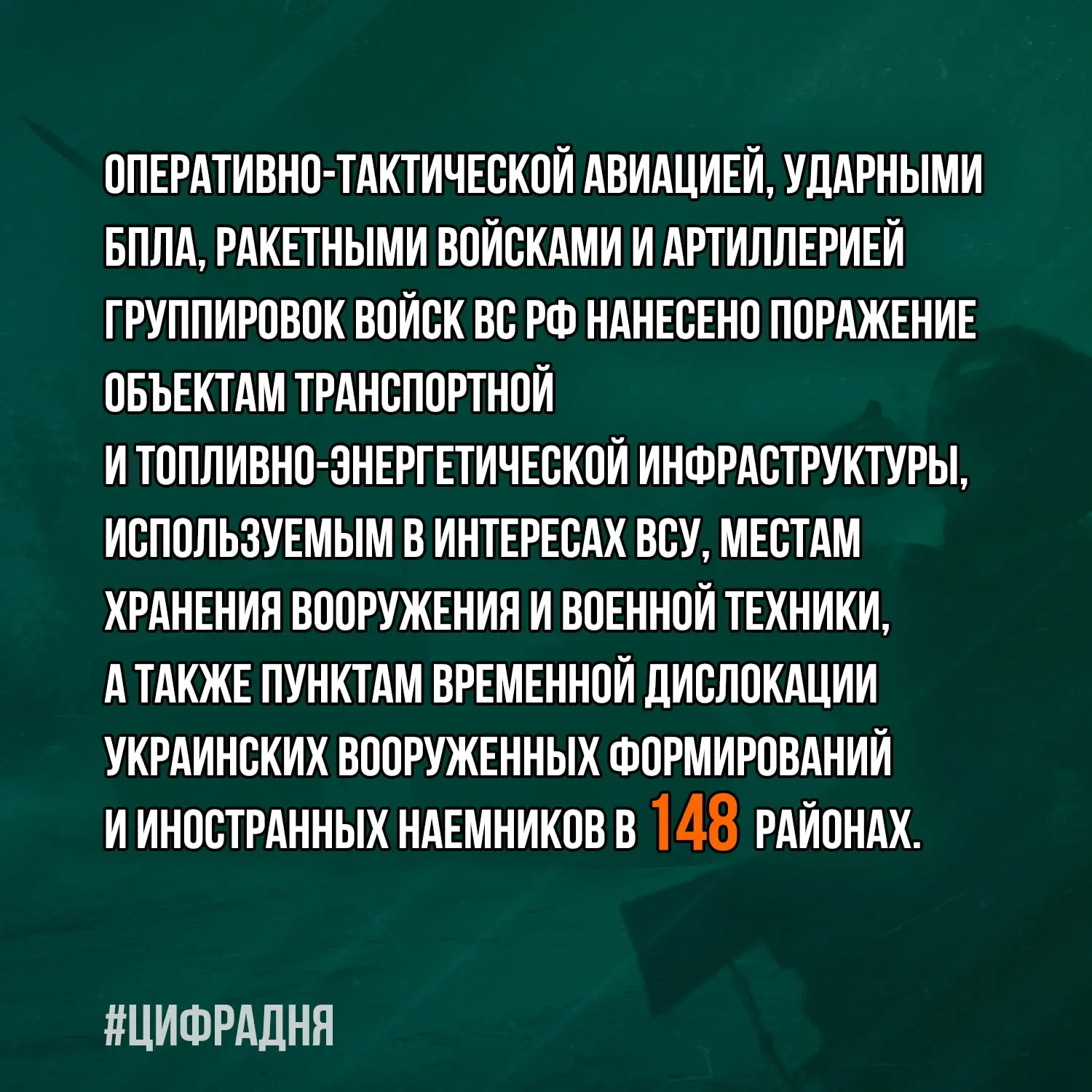✈️ Оперативно-тактической авиацией, ударными беспилотными летательными аппаратами, ракетными войсками и артиллерией группировок войск Вооруженных Сил Российской Федерации нанесено поражение объектам топливно-энергетической инфраструктуры, обеспечивающим работу военно-промышленного комплекса Украины, а также пунктам временной дислокации украинских вооруженных формирований и иностранных наемников в 137 районах.