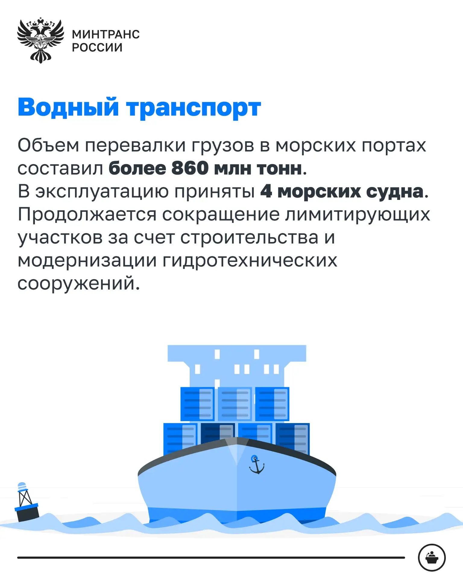▶️ Завершили проекты в морских портах в Мурманске, Усть-Луге и Ванино. Совокупная мощность терминалов выросла на 25 млн тонн. На реке Дон состоялась тестовая проводка судна через построенный шлюз Багаевского гидроузла, а на Волге продолжается реконструкция Городецкого.