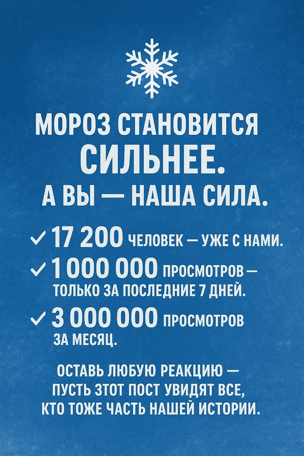 ❄️ Оставь любую реакцию — пусть этот пост увидят все, кто тоже часть нашей истории.