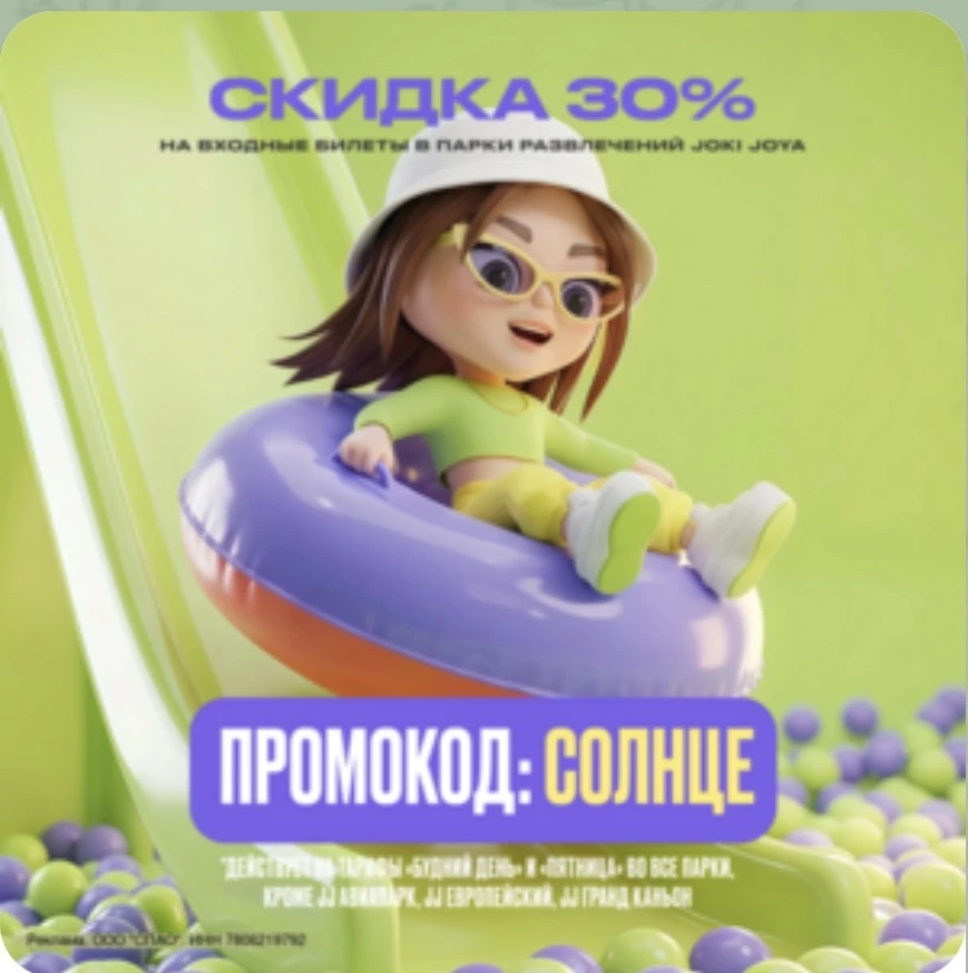 Дарим скидку 30% на входные билеты в парки развлечений Joki Joya. Акция действительна для тарифов «Будний день (пн-чт)» и «Пятница».