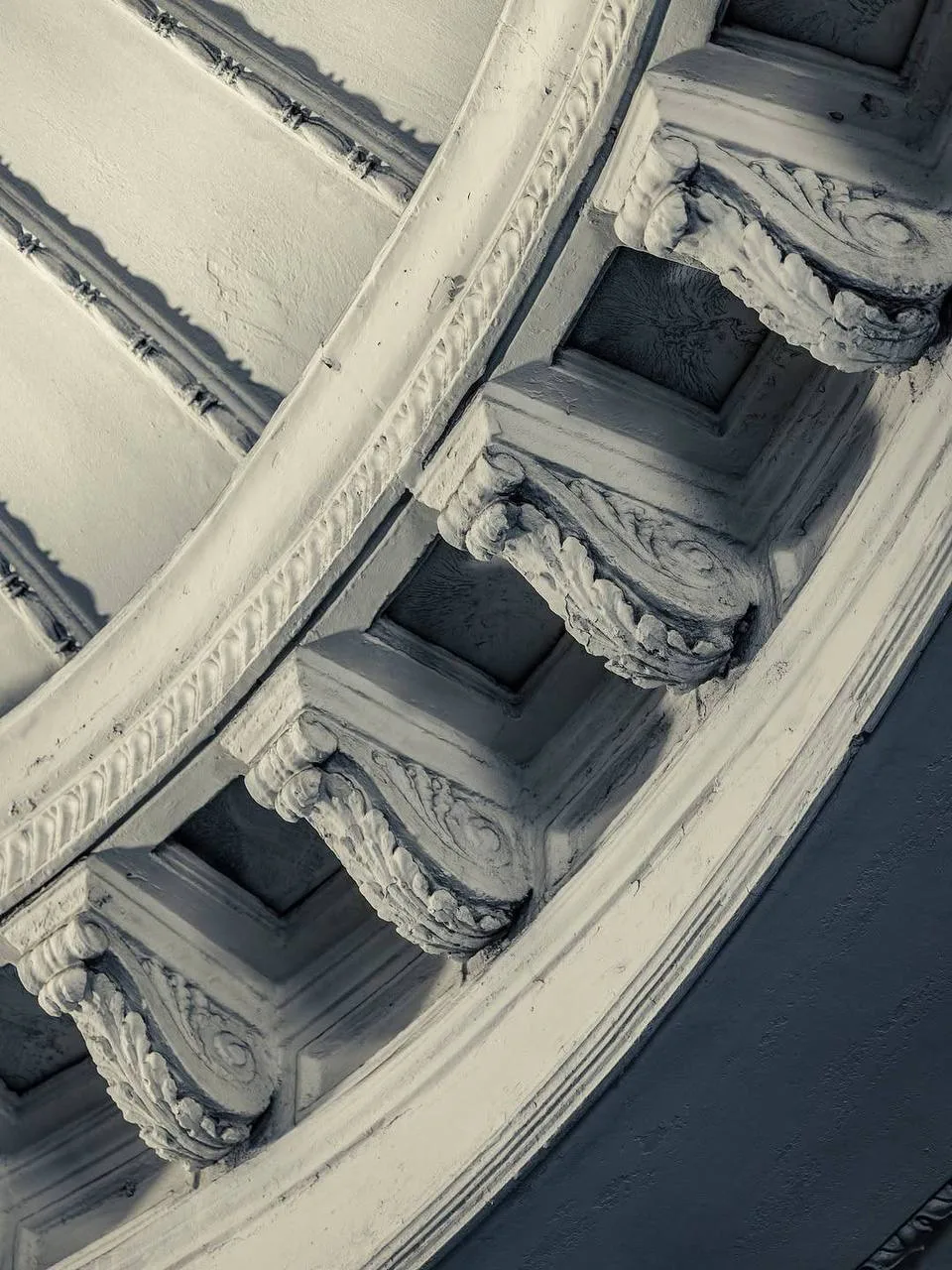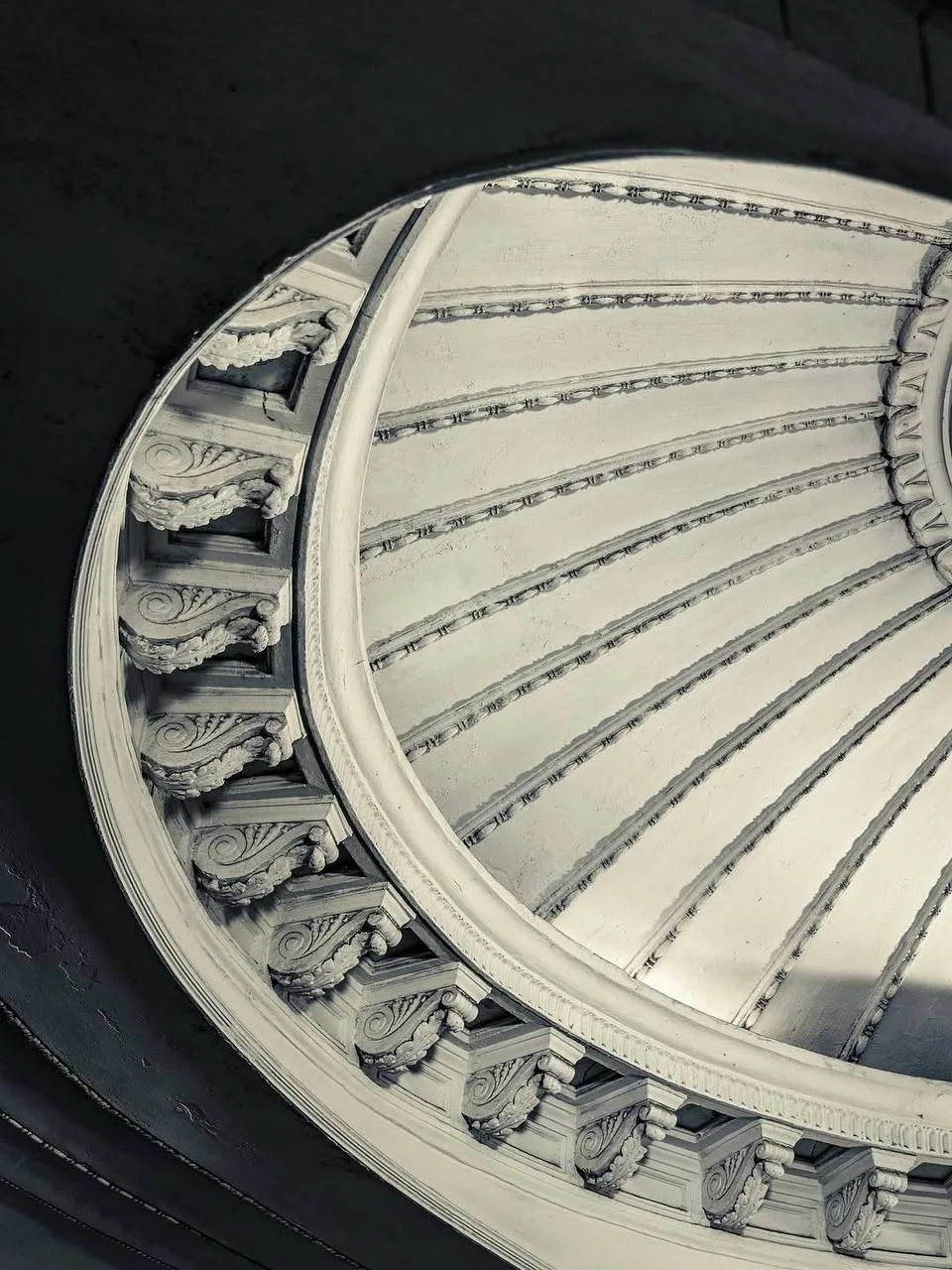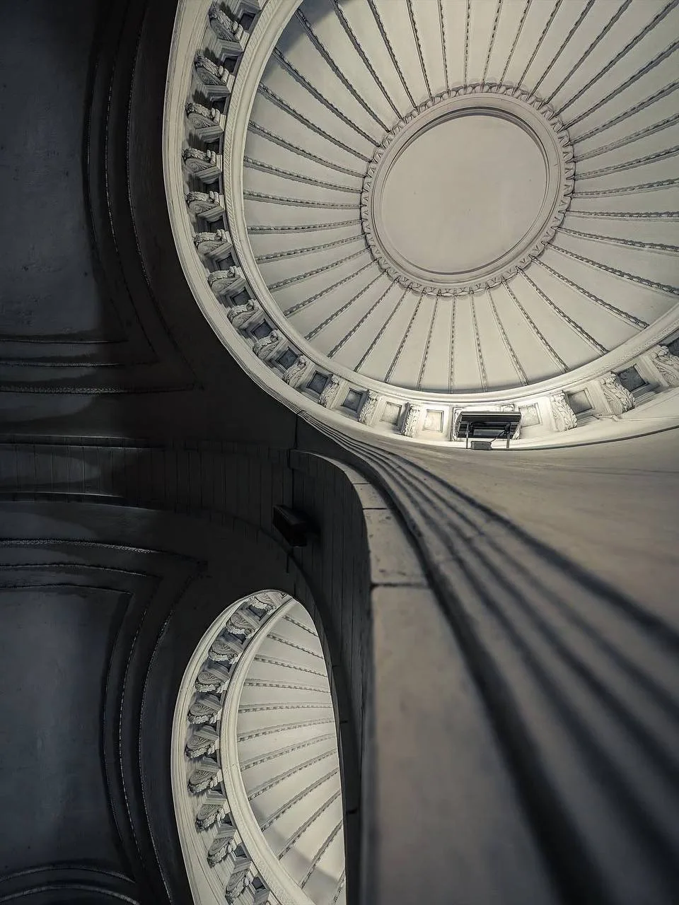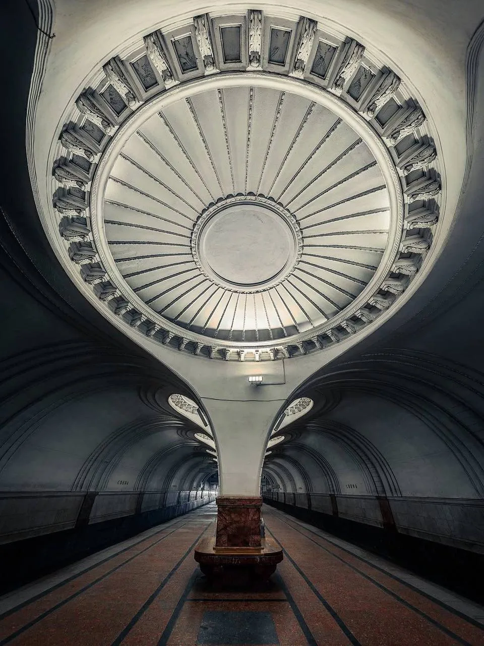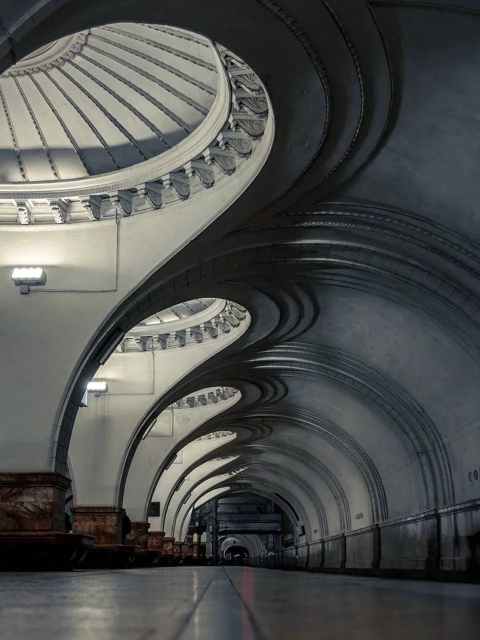 Два свода, мягкое освещение изнутри куполов, ритм колонн. Всё очень сдержанно, но за счёт этого пространство ощущается глубже и