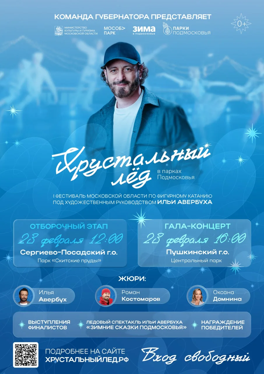 23 февраля в парках Подмосковья пройдут заключительный отборочный этап и гала-концерт фестиваля фигурного катания «Хрустальный лед» под художественным руководством Ильи Авербуха.
