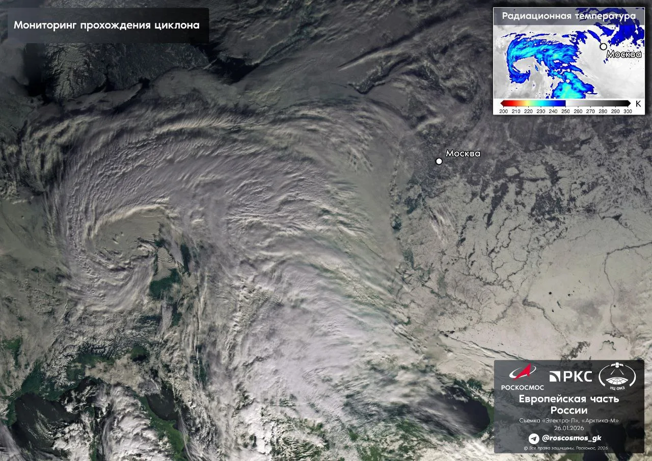 На фото — спутниковый снимок снежного циклона, надвигающегося на Москву и область, от «Роскосмоса».
