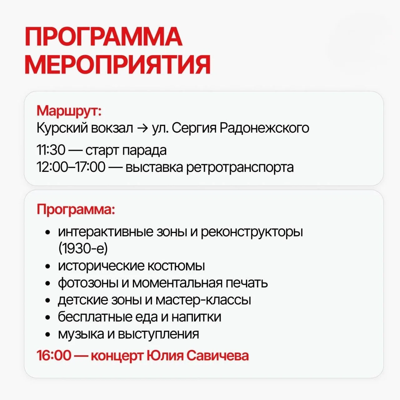 Также нас ждет развлекательная программа с интерактивными зонами в духе 1930-х годов и реконструкторами, которые создадут атмосферу прошлых лет. Посетителей ждет выставка исторических костюмов сотрудников трамвайного комплекса, фотозоны и стойки с моментальной, а также выступления артистов.