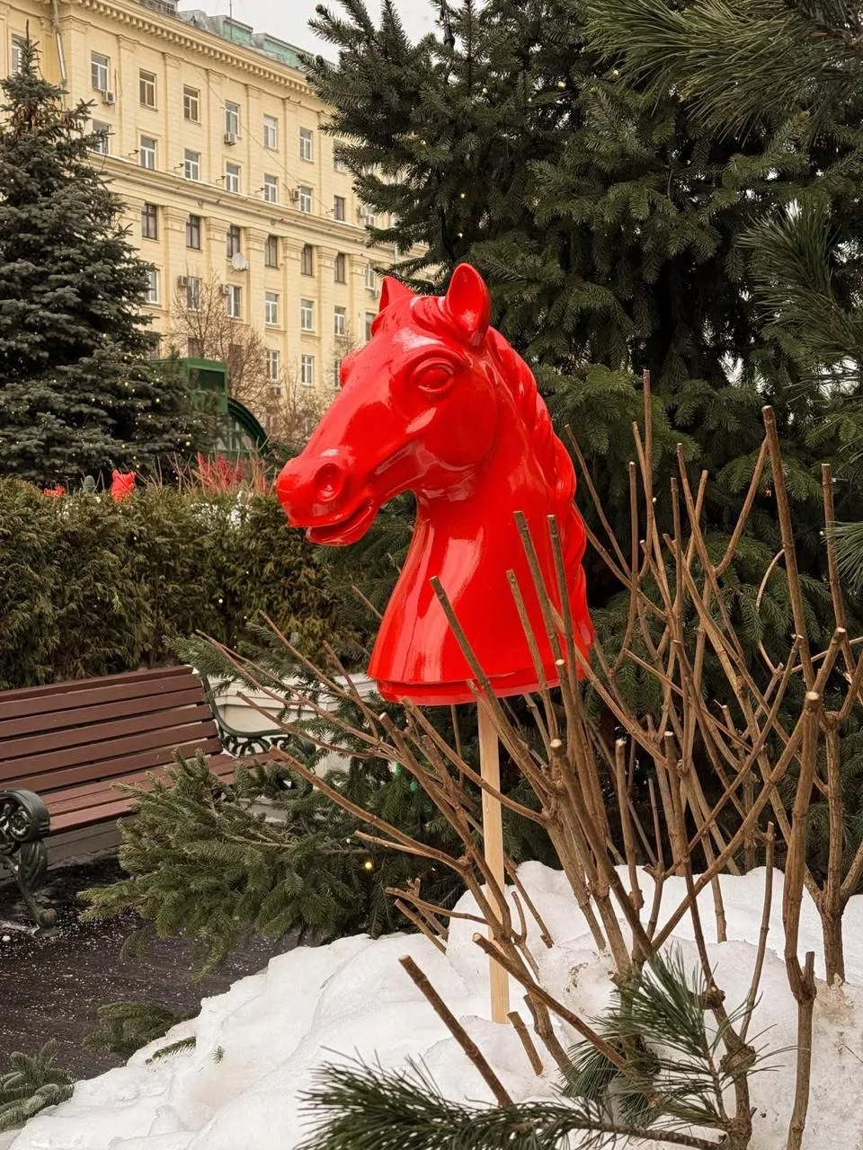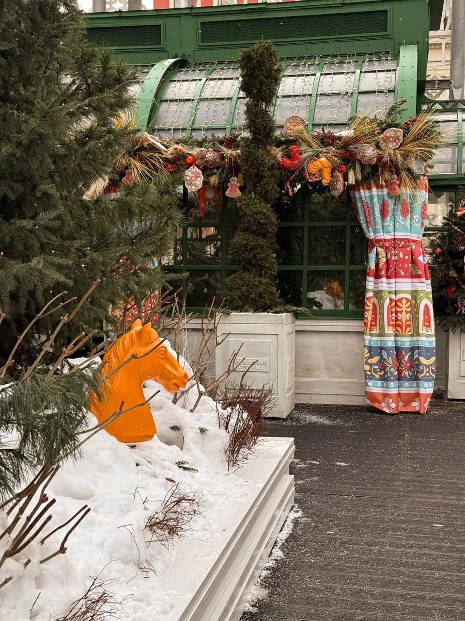 — территория украшена фигурками лошадей, сухим и расписным декором.