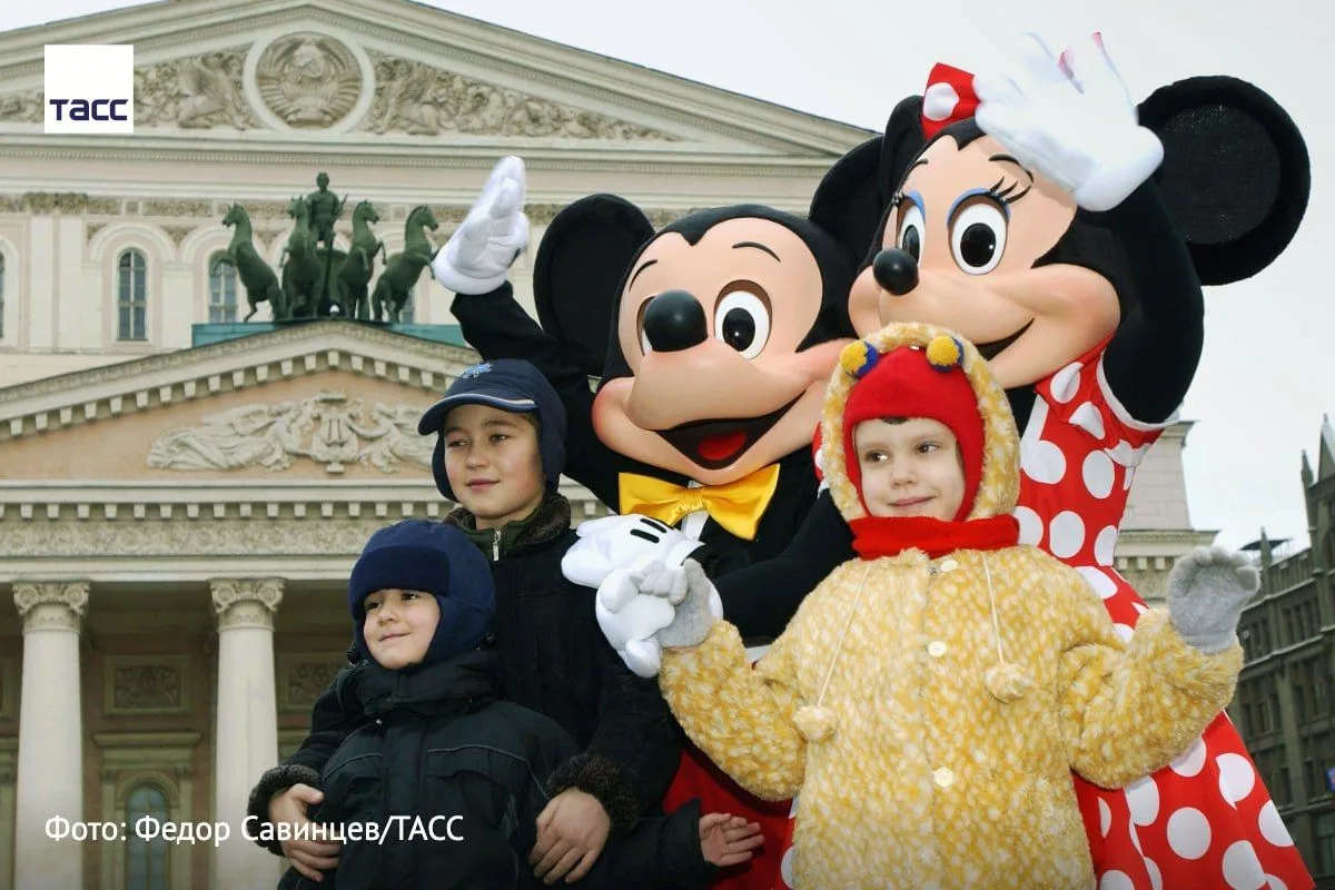 Микки и Минни Маус фотографируются со своими поклонниками у Большого театра.