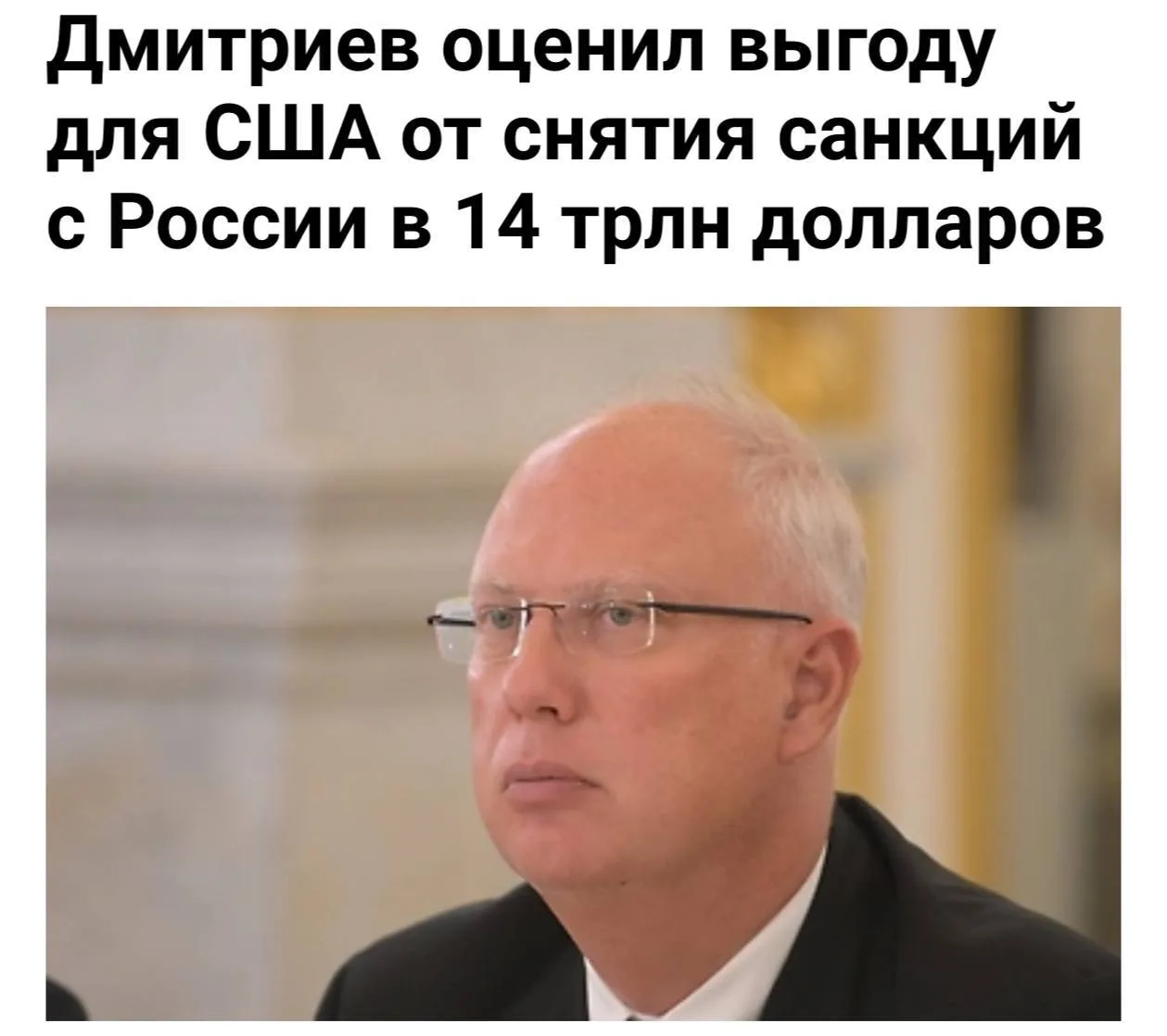 «Отмена санкций против России отвечает интересам США», заявил он. Так Дмитриев прокомментировал публикацию The Economist, в которой говорится, что Россия готова предложить США $12 трлн в обмен на снятие санкций. Эта сумма сопоставима почти с 30 годовыми бюджетами России.