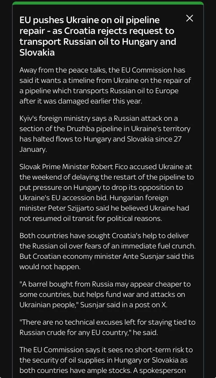 ⚡️ЕС требует от Украины отремонтировать трубопровод «Дружба» для возобновления поставок российской нефти в Словакию и Венгрию, — Sky News