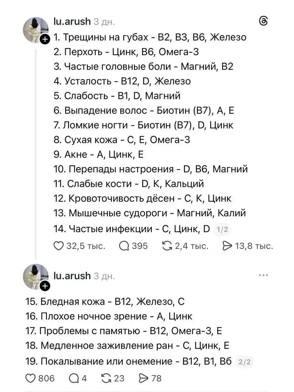 💊 В сети разлетелся список витаминов, который связывает разные проблемы организма с нехваткой конкретных витаминов и микроэлементов