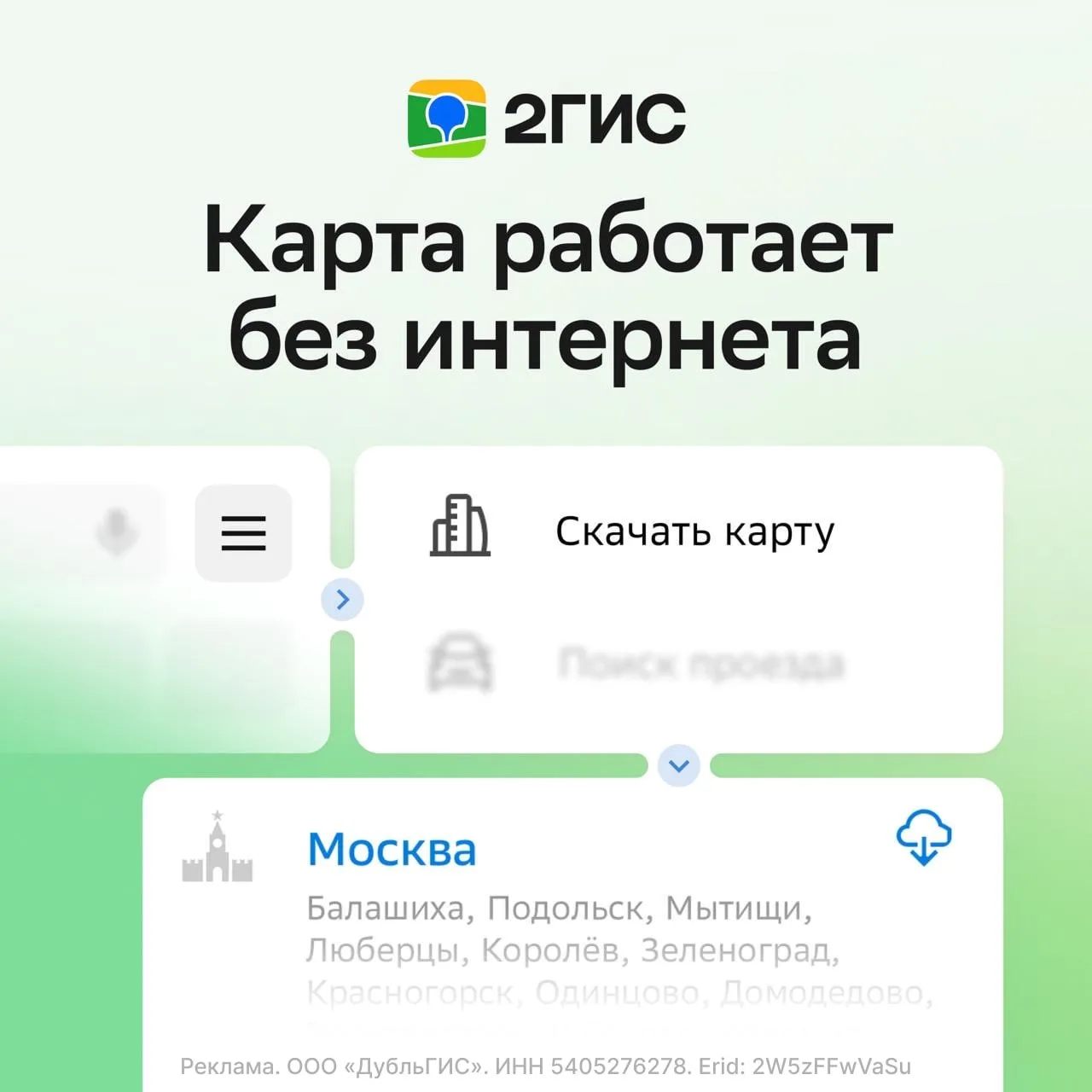 Скачивайте офлайн-карту Москвы в 2ГИС и пользуйтесь навигацией без интернета.