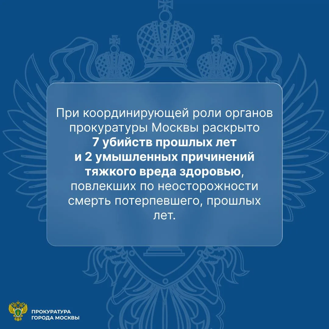 При координирующей роли органов прокуратуры Москвы раскрыто 7 убийств прошлых лет и 2 умышленных причинений тяжкого вреда здоровью, повлекших по неосторожности смерть потерпевшего, прошлых лет.