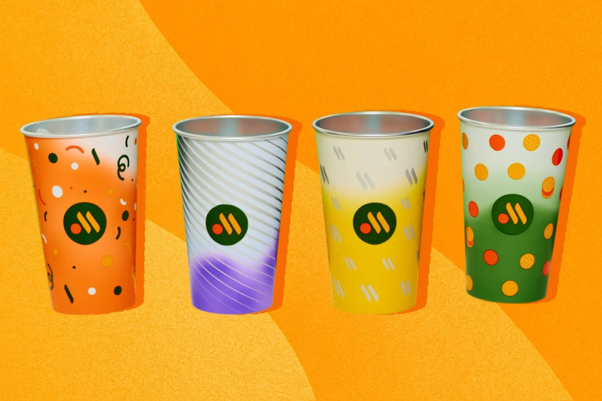 Стаканы многоразовые и меняют цвет в зависимости от температуры напитка. Всего в коллекции 4 цвета: жёлтый, оранжевый, зелёный и фиолетовый. Получить стаканы можно при покупке комбо